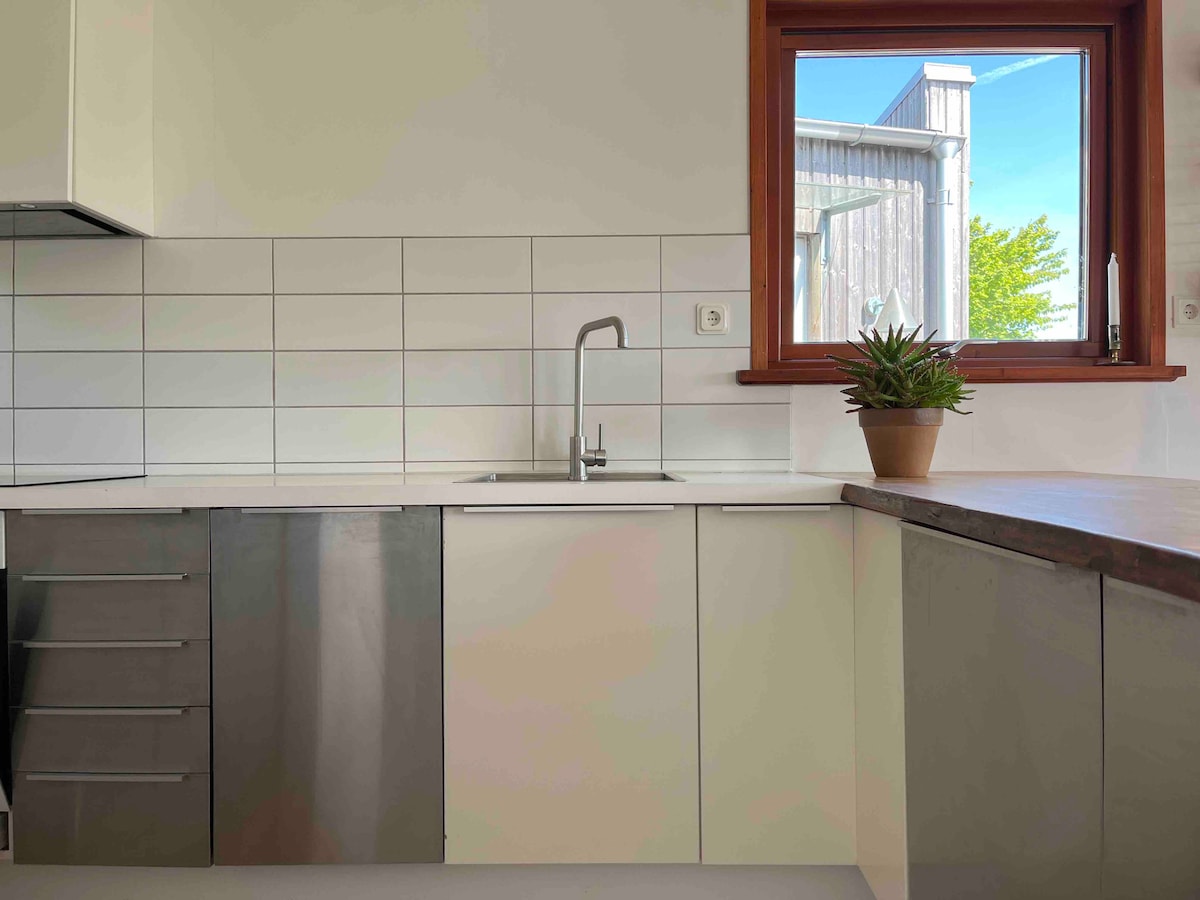 Maradj otthonos és békés a 19. századból származó régi, fagerendás hosszában. A hely vidéki, állatokkal és természettel közvetlenül az ajtó előtt, ugyanakkor közel a városhoz, az éttermekhez, a szórakozáshoz, a vásárláshoz és a strandhoz/úszáshoz. Itt csendes és tágas, körülbelül 120 négyzetméteres, 2 hálószobával, konyhával, nagy nappalival, kanapéval, TV-vel és étkezővel, valamint vécével, zuhanyzóval, mosógéppel és szárítógéppel felszerelt fürdőszobával. A ház mellett egy buja, félreeső terasz található grillezővel közvetlenül a legelők mellett, birkákkal és lovakkal. Az autó, amit a szabadban parkolhatsz le.
