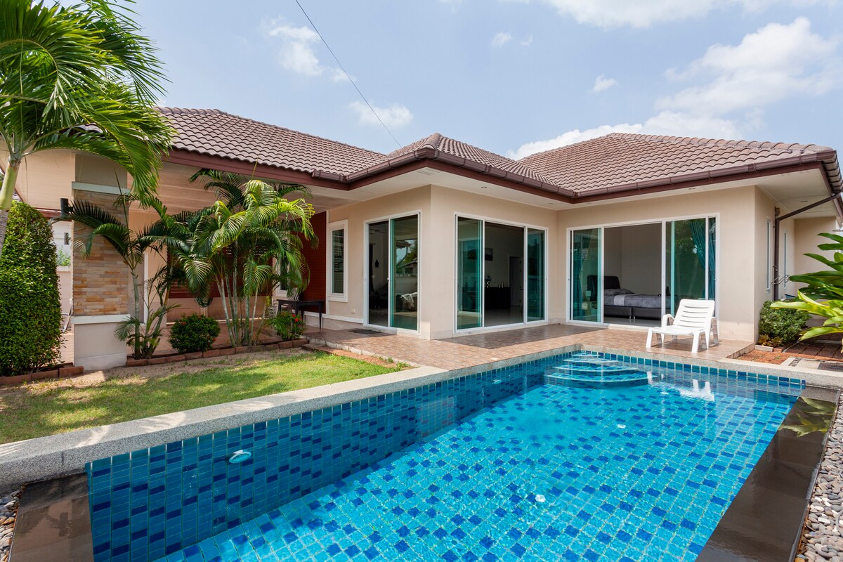 🌿 Your stylish pool villa getaway. -3 bedrooms 3.5 bathrooms (King Beds) -Private attached bathrooms -Utilities included -Pool w/ jetted spa -Pool cleaning (2x a week) -WIFI (Hi speed) -Smart TVs (in all rooms) -Blackout curtains -Washer/Dryer -Equipped Kitchen -BBQ grill (500 THB) -Fresh Towels -Shampoo/Conditioner/Soap -7-11 & Lotus nearby -Short drive to Jomtien Beach (20-25 min) ❤️ Perfect for family vacation, romantic getaway, and longer stay. ⭐️SPECIAL weekly & monthly price Book now❗️