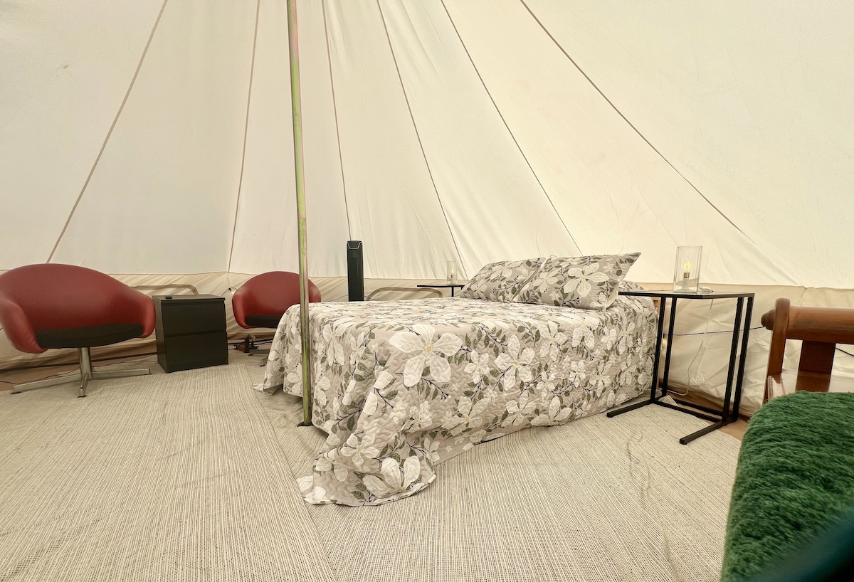 Feltűnő, teljesen fekete harangsátrunk tökéletes glamping alvást kínál – sötét, otthonos és nagyon pihentető. Az akkumulátoros hangulatvilágítás meleg hangulatot teremt a csillagos éjszakákon. Bent egy kényelmes franciaágy és két egyszemélyes ágy található, és szükség esetén további hálózsákok is elférnek. Tökéletes családoknak vagy pároknak, akik egyedi és pihentető kiruccanást keresnek a természetben.