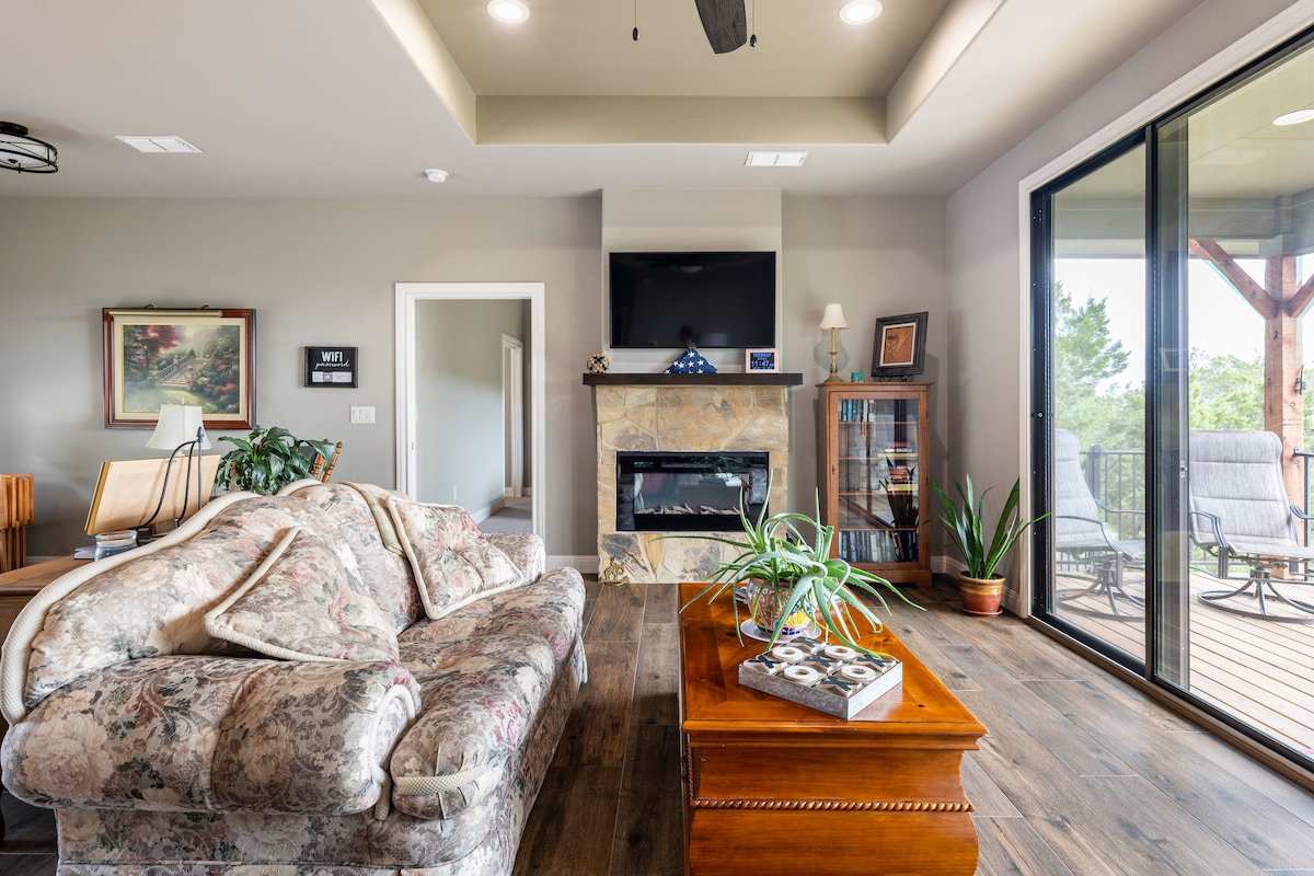 Your Lake Travis retreat: relax in the private hot tub, cozy up by the wood-burning fireplace, enjoy movie night in the 8-seat theater, and play together in the foosball + arcade game room. With 4 king suites, a bunk room, dedicated workspace, fast Wi-Fi, and space for groups, this home is perfect for family gatherings, remote work, and getaways. Pets welcome! Minutes from Lake Travis and local dining. Book your Hill Country escape today!