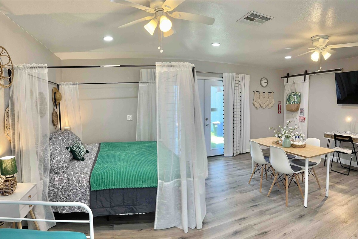 ✨Lux Studio✨ Üdvözlünk a Huntington Beach Nestben! Ez a gyönyörűen felújított CSATOLT stúdió egy bájos, századközepi tengerparti bungaló része. A világhírű Huntington Beach és számos más lenyűgöző kaliforniai strand csak néhány percre található, így tökéletes tengerparti üdülőhely. A stúdió jellemzői: * Plüss king méretű ágy * Teakonyha * Fürdőhelyi stílusú fürdőszoba * Beépített mosógép és szárítógép * Saját bejárat a kényelmed érdekében Kutyákat szívesen látunk! 🐾