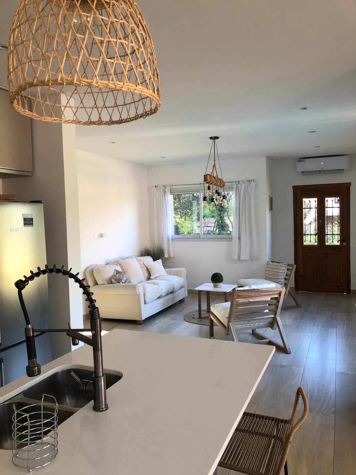 Casa 2 ambientes cómoda y cálida. Tiene garage techado con portón automático. Patio con zona de jardín con flores y parrilla. En el living hay un sillón cama (2 plazas), se encuentra la TV y la zona de trabajo. Integrado a este espacio está la cocina/comedor. Todo este espacio tiene aire acondicionado frio/calor y estufa a gas. El baño posee mampara de vidrio templado. Habitación con aire acondicionado y sommier tamaño queen size.
