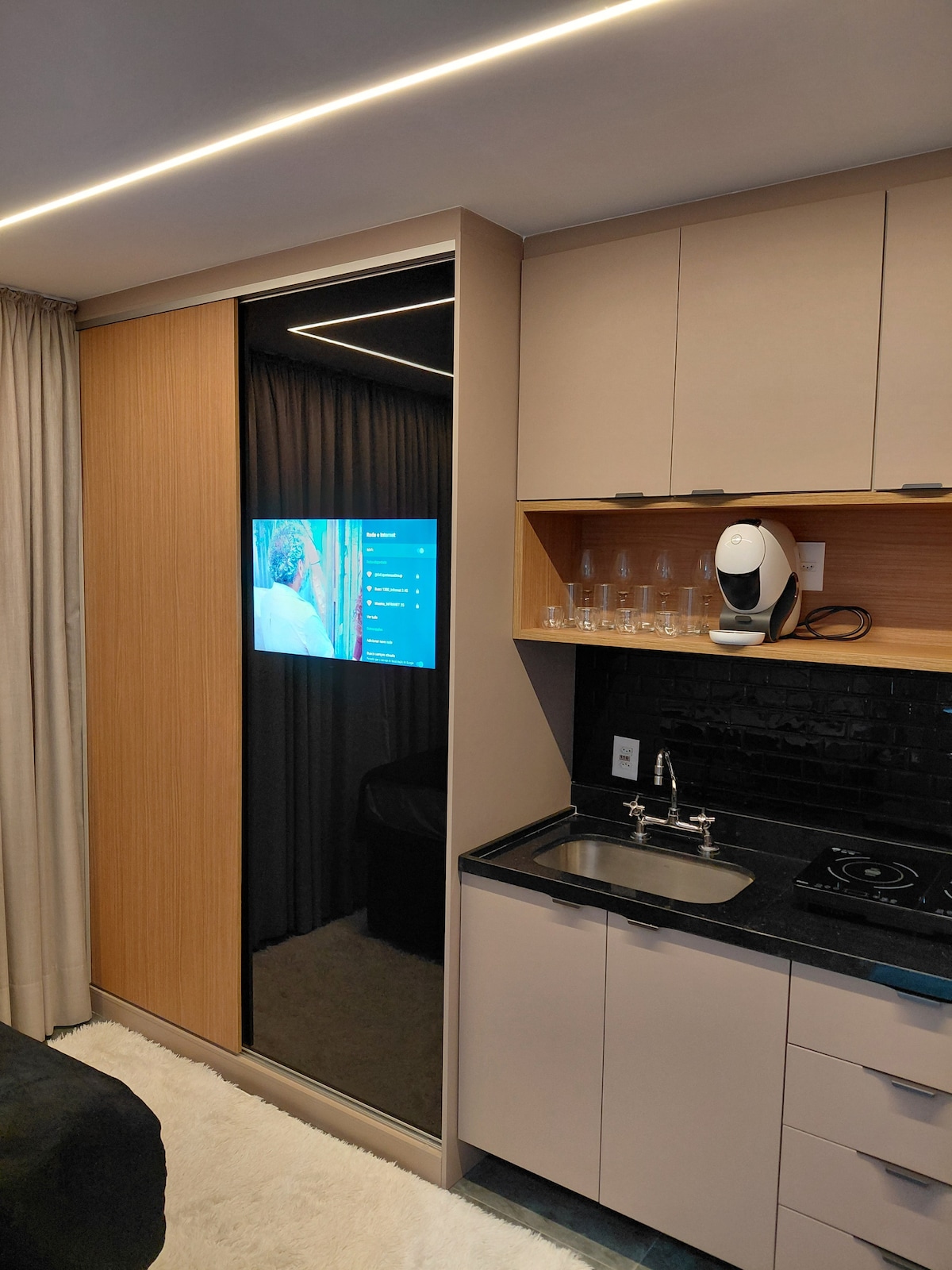 Studio contemporâneo, impecavelmente decorado e cheio de detalhes sofisticados, situado na área mais desejada de Moema, a apenas 6 min a pé da estação Moema e a 900 metros do Parque Ibirapuera. Um espaço ideal para casais, viajantes solo ou a trabalho, reunindo conforto, estilo e praticidade. O Studio conta com cama de casal, enxoval premium Teka Profiline, ar-condicionado, Wi-Fi rápido, Smart TV 50'', cozinha totalmente equipada e um banheiro refinado, com toalhas macias e amenities completos.