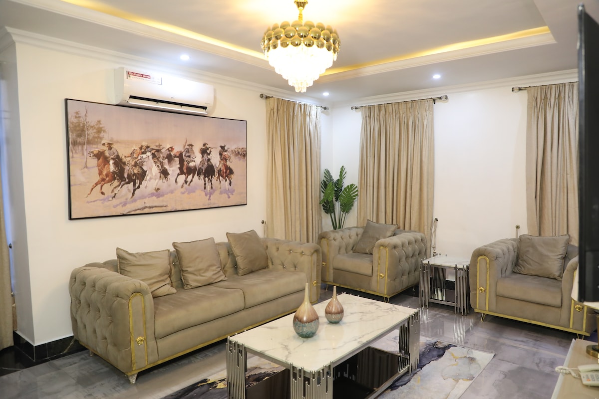 Üdvözöljük ebben a gyönyörűen kialakított, egy hálószobás apartmanban, amely a Toyin street ikeja utcában található, közel mindenhez. Teljesen berendezett, modern és kifinomult kényelmi szolgáltatásokkal, hogy zökkenőmentes életélményt nyújtson, ez a lakás ötvözi az eleganciát a funkcionalitással, átgondoltan berendezett elegáns bútorokkal, 65 hüvelykes Samsung QLED TV-vel és kortárs művészeti alkotásokkal, ideális pihenéshez és szórakozáshoz. Tágas szentély kényelmes ággyal, teljesen felszerelt konyhával és a legmodernebb készülékekkel.