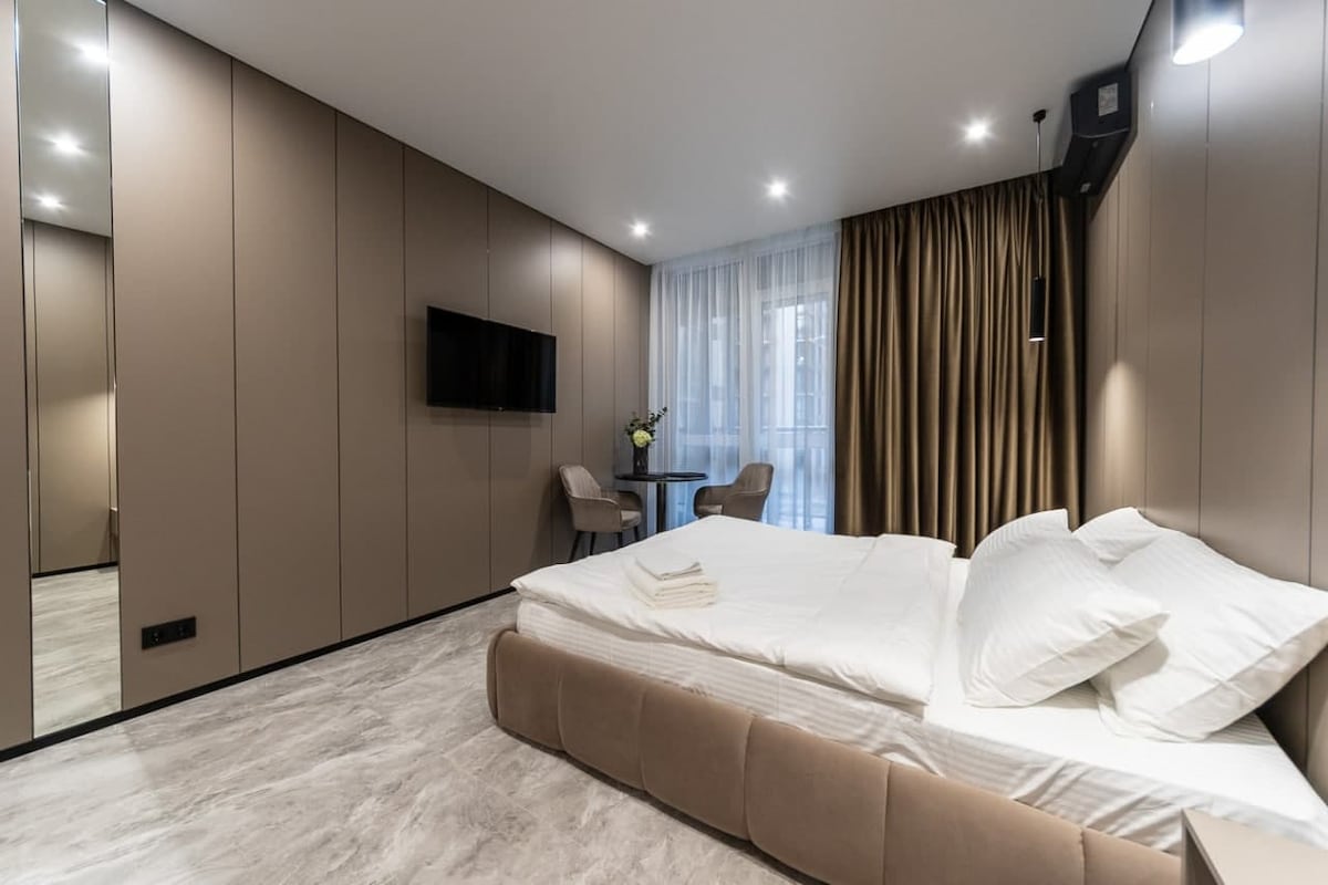 Discover minimalist peace in our designer 1-bedroom apartment in Kyiv’s heart. Space: Queen bed, Smart TV, AC & high-speed Wi-Fi. Kitchen: Fully equipped with coffee/tea. Location: New building near Universytet Metro & Shevchenko Park. Quiet, yet steps from top cafes. Perks: Private balcony, city views, and easy self check-in. ✨ Clean, serene, and perfectly located. Book your unique Japandi experience today!