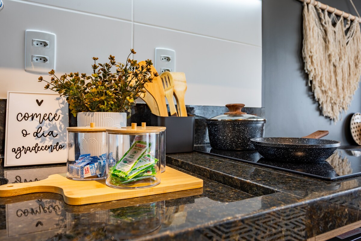 O Flat tem arquitetura assinada por um dos profissionais mais renomados de Goiânia. A idéia é você poder se sentir em casa durante a sua hospedagem. Tudo automatizado; luzes, cortina, TV, Ar Condicionado que oferecem comodidade e requinte, basta pedir para Alexa. Escute músicas, assista a mais de 1.600 canais abertos e fechados. Tome um banho gostoso com uma ducha generosa. Faça fotos e descanse na varanda com uma vista do por do sol sensacional e teto de acrílico.