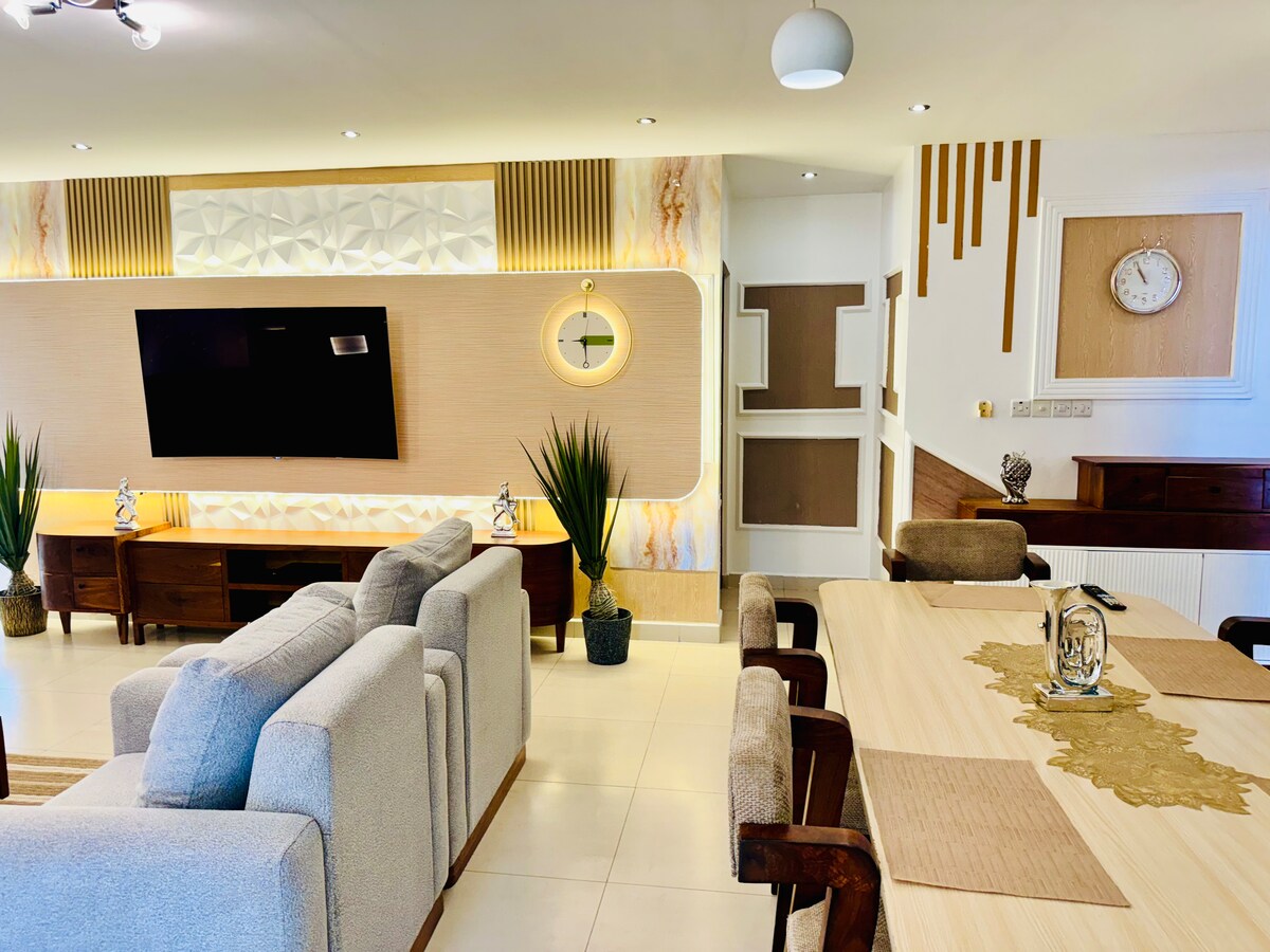 This is a Brand New apartment with half city view and half ocean view,its luxurious and very comfortable with 3 smart tvs in total and rooms having tvs,driven by 100mbps fast internet speed,full time generator available…the apartment is located at the city with supermarket and restaurants minutes away,very spacious and having all necessary utilities inside to make your stay feel like home.Very high security at the premises and secure basement parkingGood for families,couples and foreign guests