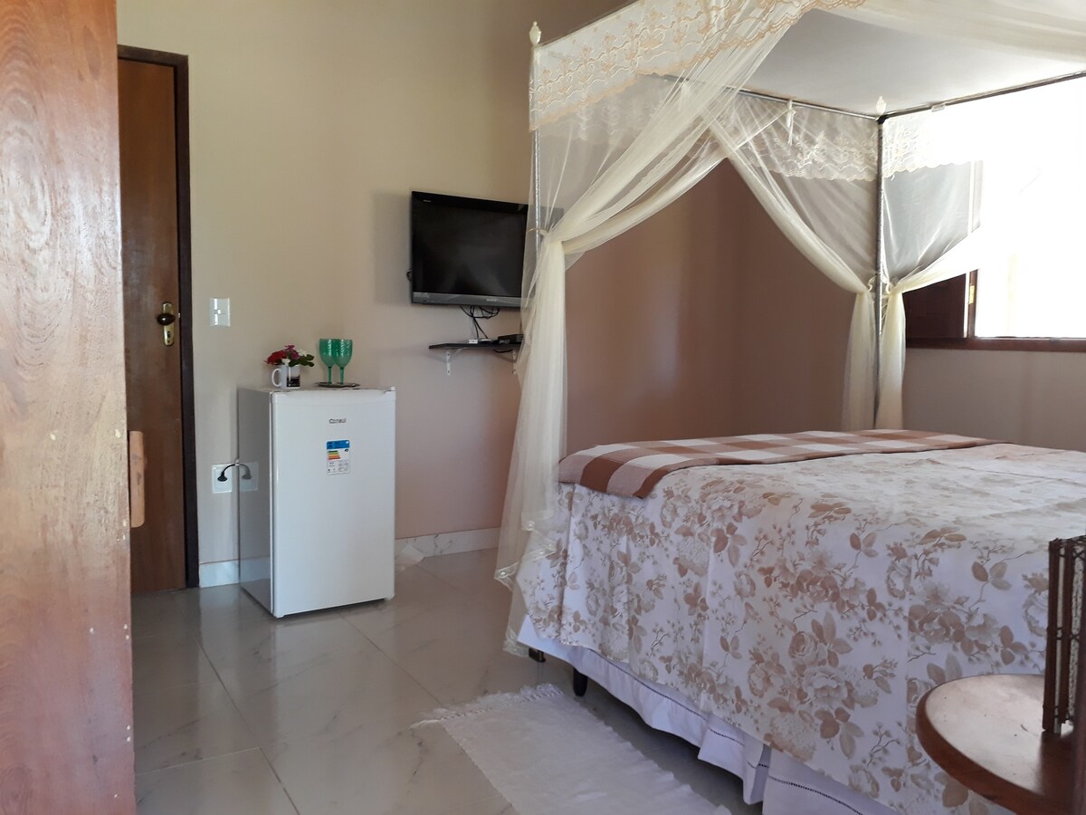 Suíte privativa com banheiro interno . Tv LED Smart , ar condicionado , Chuveiro aquecido , Frigobar, 1 cama casal 1 beliche Preço por ocupação. •Piscina Liberada •Jardim •Quiosque com Churrasqueira •Espaço gourmet microondas, geladeira, liquidificador, cafeteira, pratos talheres, e copos. •Refeitório •Pode trazer alimentos e bebidas .