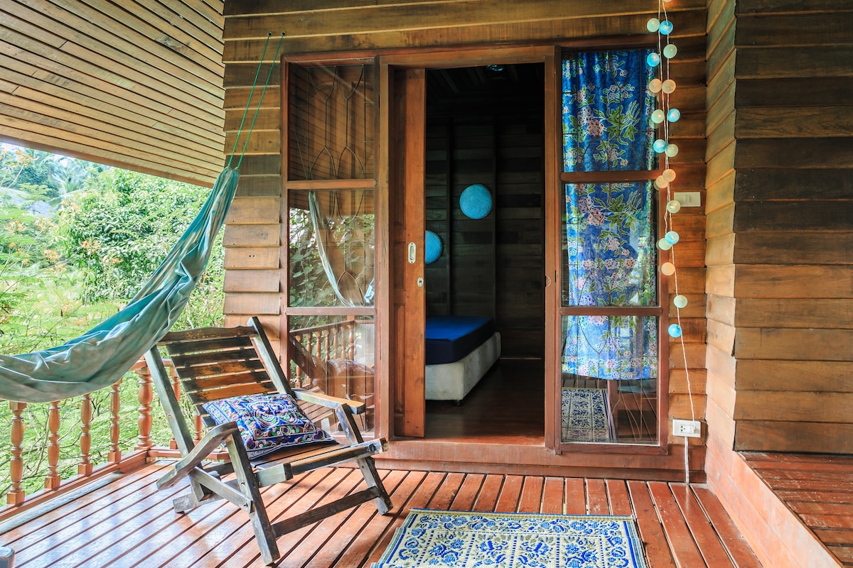 You are traveling north. The highway is solid, the mountains rich with forest. Checking your map, you realize just how many caves, temples and cafés are in the area. You make a mental note: "Go explore." First you check into your AirBnB. You find yourself surrounded by orchards, ever closer to the mountain. Directly at the foot of Chiang Dao mountain stands your house. Wooden with fiber internet. 5min ride to the hot springs, and 8min to town. Welcome to the "Yellow Door Cottage".