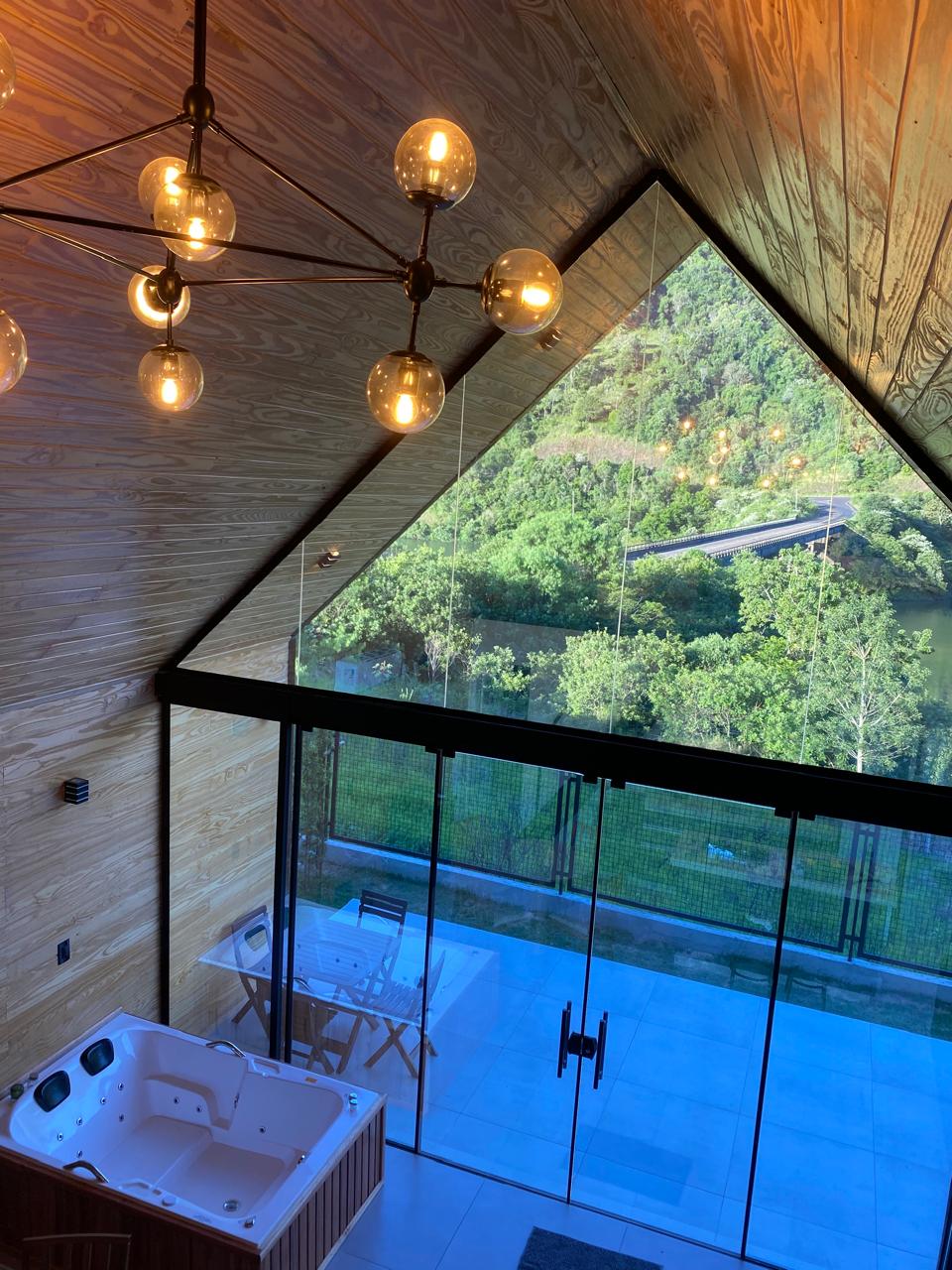 Nosso chalé está localizado no topo de um morro, cercado por árvores e com uma vista ampla para um vale encantador, montanhas e paisagens que mudam a cada momento do dia. • Hidromassagem aquecida no deck com vista para o vale • Chalé com frente de vidro e vista privilegiada do nascer do sol • Lareira interna e firepit externo • Wi-Fi de fibra óptica (200MB) • TV 4K com Netflix e diversos aplicativos • Cozinha completa para preparar refeições