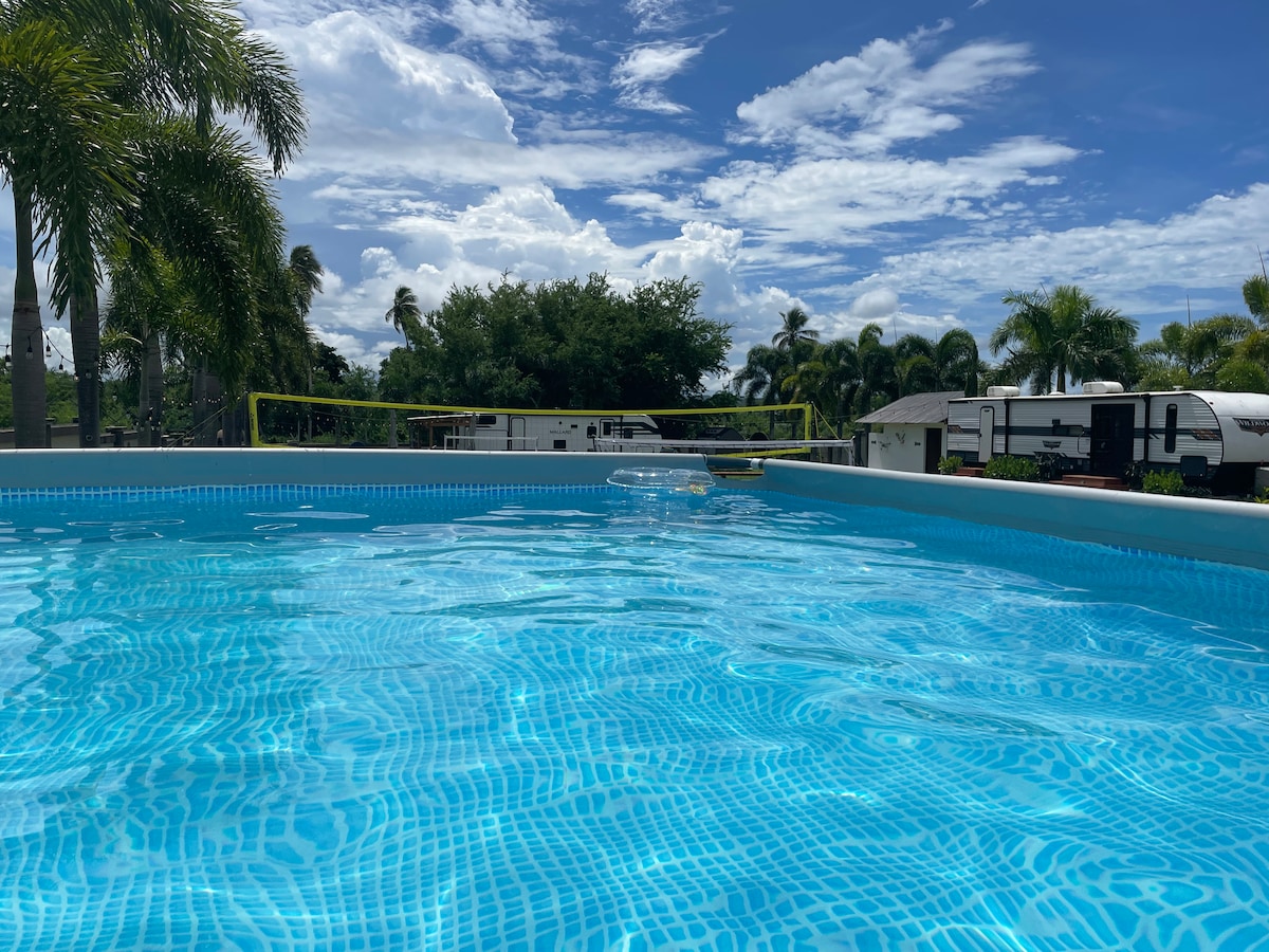 Escape to the tranquility of nature less than 5 minutes from Jobos Beach. Updated and decorated camper on our 5 acre farm. Bright, cozy and cheerful inside and large deck with outdoor living space. Indoor and outdoor kitchens, private outdoor shower. Small pool and deck, tiki fire pit and lush plantings. The farm is 5 acres and has large trees, a fire pit, swing, and lots of outdoor space. See hummingbirds, parrots, iguanas and horses.