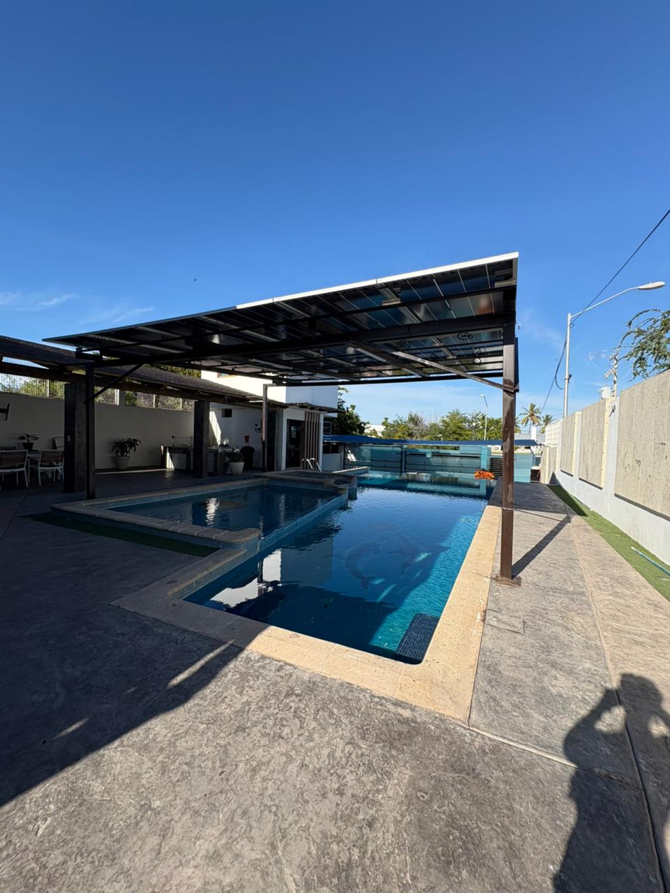 50 MBPS KORLÁTLAN INTERNET. Gyönyörű nyaraló a privát Residencial Las Brisasban, 4 hálószobával, három és fél fürdőszobával, egy jacuzzival, tágas konyhával, családi bárral és bőséges hellyel az élethez, hihetetlen terasszal a privát eseményedhez és 3 autó számára parkolási lehetőséggel. Nuevo Altata kiváló területén található, szemben a tengerparttal, nyílt tengerrel. A ház kiváló elhelyezkedésű, a tóra néz, és pár lépésre van a medencével és kényelmi szolgáltatásokkal rendelkező közös terek egyikétől.