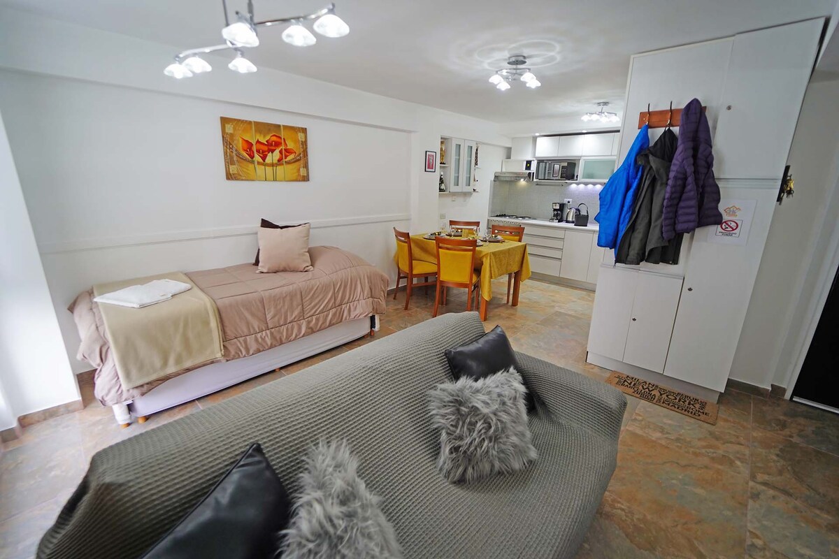 Gyönyörű lakás rövid sétára Ushuaia belvárosától. Egy hálószoba franciaággyal vagy két egyszemélyes ággyal. Az étkező konyha tágas és kényelmes, és minden felszereléssel rendelkezik a teljes függetlenséghez. Smart TV-vel, kábellel és nagy sebességű Wi-Fi-vel. A fürdőszoba tágas és teljesen felszerelt. Nézd meg a teraszt 360 fokos kilátással az egész városra. Ez a különleges hely közel van mindenhez - könnyű lesz megtervezni a látogatásodat.