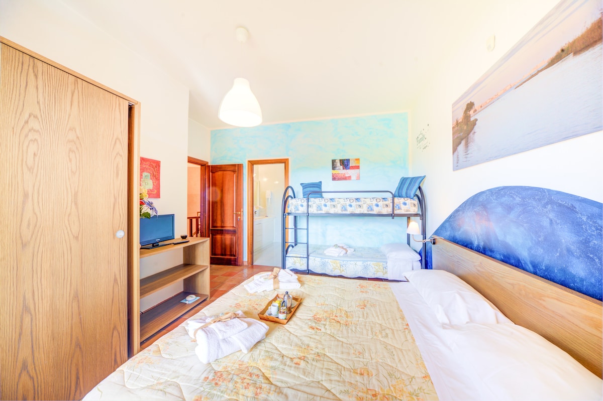 Camera tripla arredata in stile rustico, molto spaziosa con ingresso indipendente e bagno privato, dotata di tutti i comfort, climatizzata, con frigo bar e tv, adatta ad ospitare fino a 3 persone.