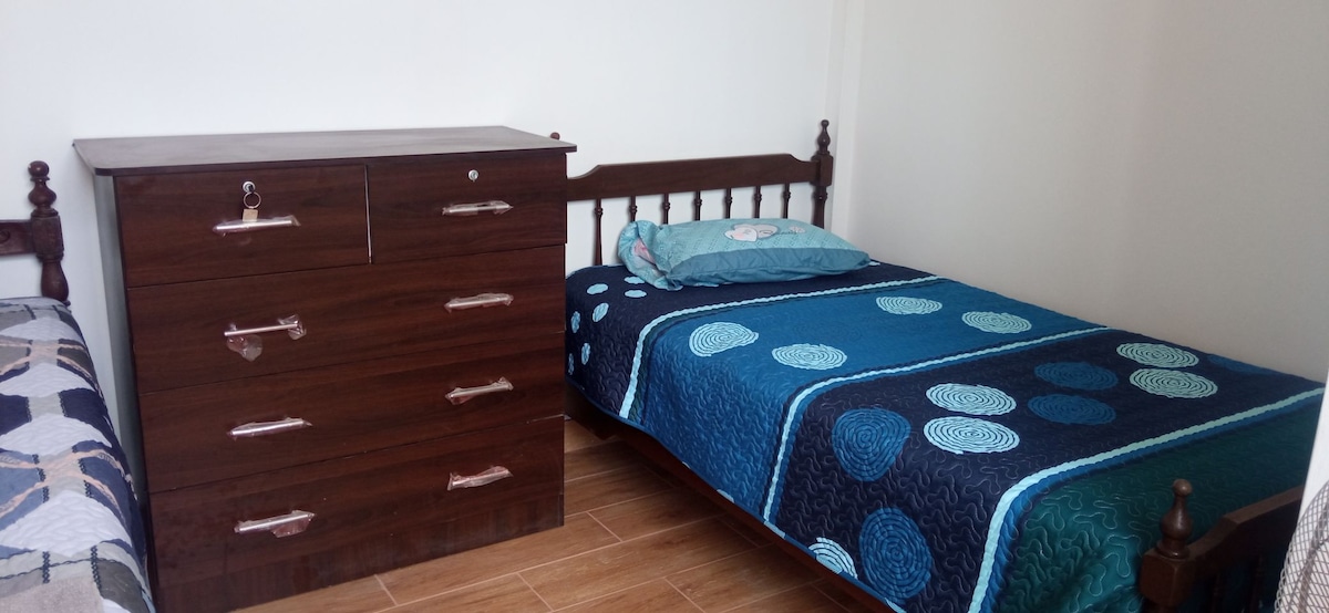 Comodidad y tranquilidad en una zona perfecta, tranquila y céntrica. La habitación es ventilada, amplia, acogedora, sencilla, y está ubicada en una urbanización segura y muy cerca a paraderos, parques, tiendas, restaurants, y a la avenida que lleva a la playa. Caminando se llega en 15 minutos; y en auto, en 5.