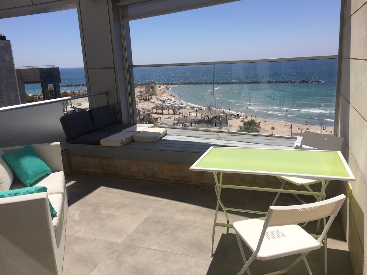 Kényeztesd magad ennek a gyönyörű lakásnak az eleganciájában. A pompás otthon hatalmas, nyílt terű nappalival, egy teljesen fehér monokróm belső térrel rendelkezik, amelyet fafaragás, minimalista esztétika, privát szauna, privát jacuzzi és grillezővel ellátott, körbefutó terasz található. A lakásunk egy perc sétára van a Dizinghof Square-től, és 6 perc sétára a tengerparttól. A hely jól felszerelt és viszonylag új. A lakásunk egy perc sétára van a Dizinghof tértől és hat perc sétára a strandtól . Éttermek és kávézók vannak a környéken. Körülbelül 25-30 percet vesz igénybe a Tel Aviv vagy Jaffa kikötője (az ellenkező irányba)