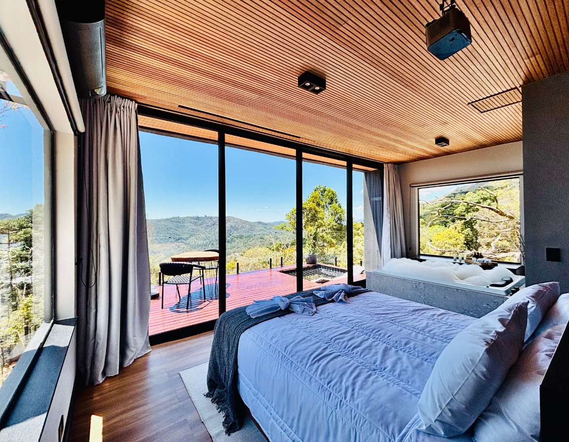 A @ montanafarmhouse__ Red Rock nevű kunyhója rusztikus és hangulatos, és a gonçalvesi Serra da Mantiqueira tetején található. Egy 20 000 m²-es, zöldövezet által körülvett telken található, lenyűgöző kilátással, teljes magánszférát biztosít, és tökéletes azok számára, akik békére és a természettel való kapcsolatra vágynak. A kunyhóban van belső fürdőkád, légkondicionált medence, kandalló, szabadtéri tűzrakóhely, grill és teljesen felszerelt konyha – mindez a felejthetetlen élményért.