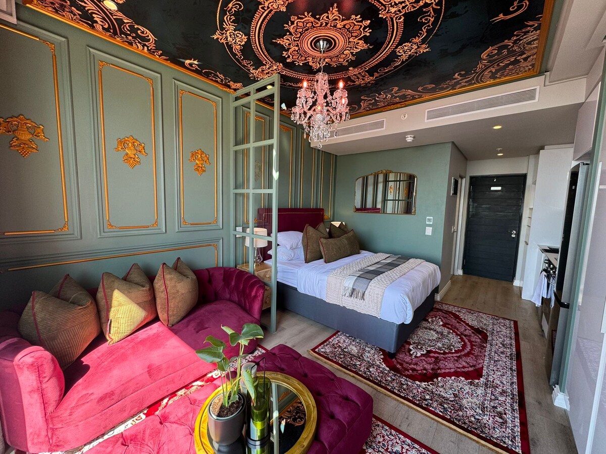 Welcome to The Sanctuary (Table mountain views) Colourful birds and deep emeralds immersive you upon entering this lush space. Fitted with the best linen and finishings to take your breath away. A fully equipped kitchenette is at your disposal. The lounge is perfect for those comfortable movie nights. In this space you will find a multi-purpose dining/work station below the 50” TV (fast and secure wifi) with a balcony overlooking Table Mountain.