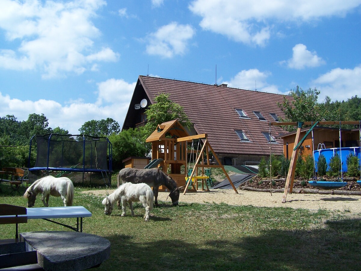 Szállás a gazdaságban 12 hektáron belül a területen. Az ablakokból kilátás nyílik a lovak legelőire. Csoportok és gyermekes családok tartózkodására összpontosítottunk. Ezért van egy játékterem és minden szükséges a kisgyermekek számára. Kültéri medence, játszótér, trambulin, kerti bútorok. A gyermekek biztonsága érdekében a vendégtér el van kerítve. Bőven van hely a játékok, grill és kandalló. A Jizera autópálya kerékpárosok, turisták és sífutók számára történő meghosszabbítása a gazdaság felett ér véget. Ha elég hó van, sínek vannak az ablakok alatt a gyerekeknek.