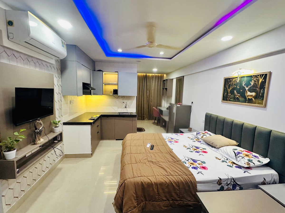 Üdvözöl a The Starlit Stays – egy hangulatos, modern stúdióapartman, amely tökéletes egyedül utazóknak és pároknak. A bevásárlóközpontoktól, általános üzletektől és egészségügyi létesítményektől csak egy rövid sétára található hely az ideális városi kiruccanásod. Élvezd az olyan intelligens kényelmi szolgáltatásokat, mint az intelligens TV, a Wi-Fi, a légkondicionáló, a kémény, a hűtőszekrény, az RO víztisztító, a gejzír és a lift. A nonstop biztonsági kameráknak köszönhetően a szálláshelyen eltöltött időd biztonságos és kényelmes. Békés, stílusos búvóhely, amelyet a kényelemre és a kapcsolatteremtésre terveztek.