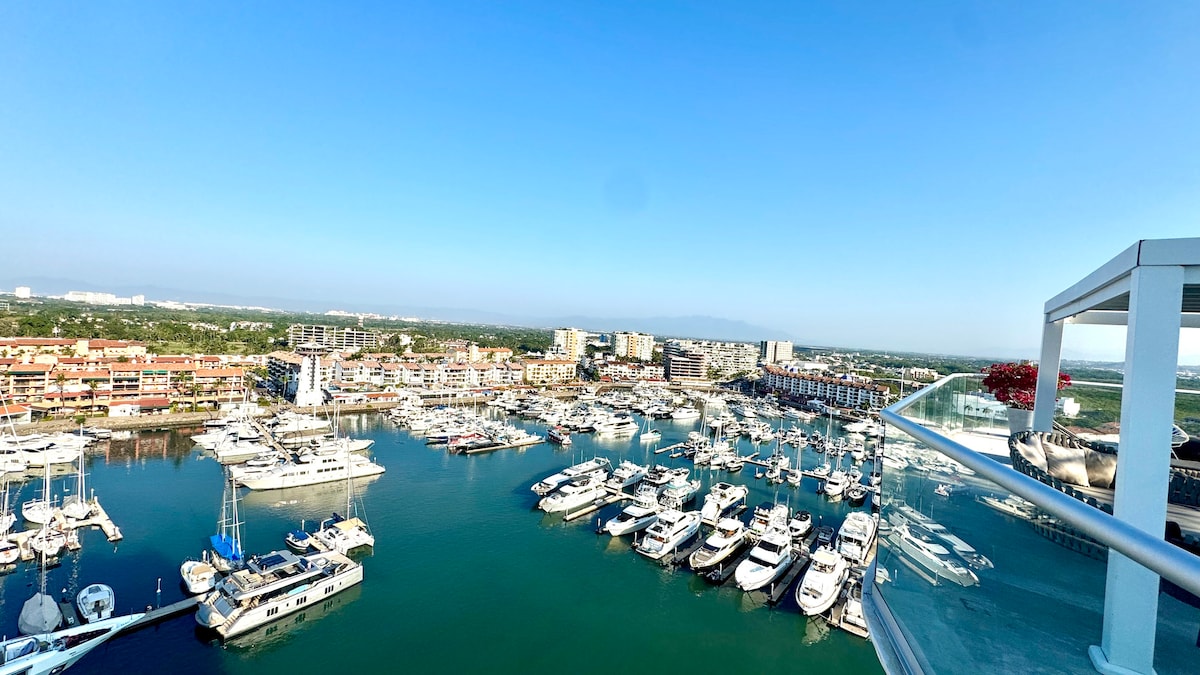 ¡Lujo en Marina Puerto Vallarta! Balcón privado en piso 9 con vistas espectaculares a yates de lujo, aviones despegando y la sierra. Condominio moderno para 5 huéspedes: 2 queen, sofá cama, A/C, Smart TV 65”, cocina con lavavajillas, lavadora/secadora. Rooftop infinity pool climatizada con vistas 360° al océano y montañas, gimnasio con vista a yates, sauna + vapor, estacionamiento techado gratis. Llegada autónoma, mascotas OK. ¡Enamórate de las puestas de sol desde tu terraza