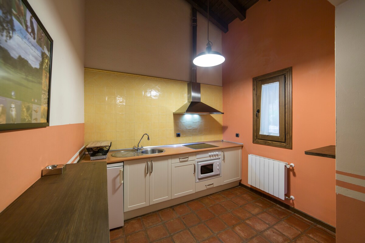 Apartamento situado en plena naturaleza, al lado de la localidad de Collado de la Vera (Cáceres). Tiene una sola planta, terraza, cuarto de baño, cocina totalmente equipada, chimenea y dormitorio. Pueden dormir hasta tres personas, ya que en el salón hay una cama individual. El apartamento tiene calefacción y ventilador de techo para utilizar en verano, no es necesario el aire acondicionado.