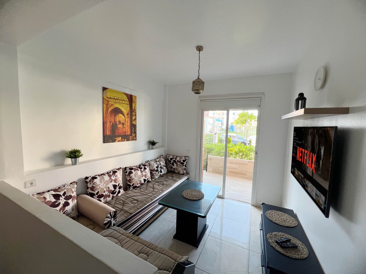 L’appartement neuf offre un confort optimal entre la mer et la forêt diplomatique. Situé à 5 min de la plage et proche du club de tir, il est idéal pour les amateurs de nature et d’activités en plein air. La résidence calme et sécurisée est à proximité de petits commerces. La forêt environnante propose des randonnées, circuits sportifs et espaces détente. Parfait pour des vacances paisibles, à 5 min de l’autoroute et 10 min de l’aéroport. Nous n'hébergeons pas de couples marocains non mariés.
