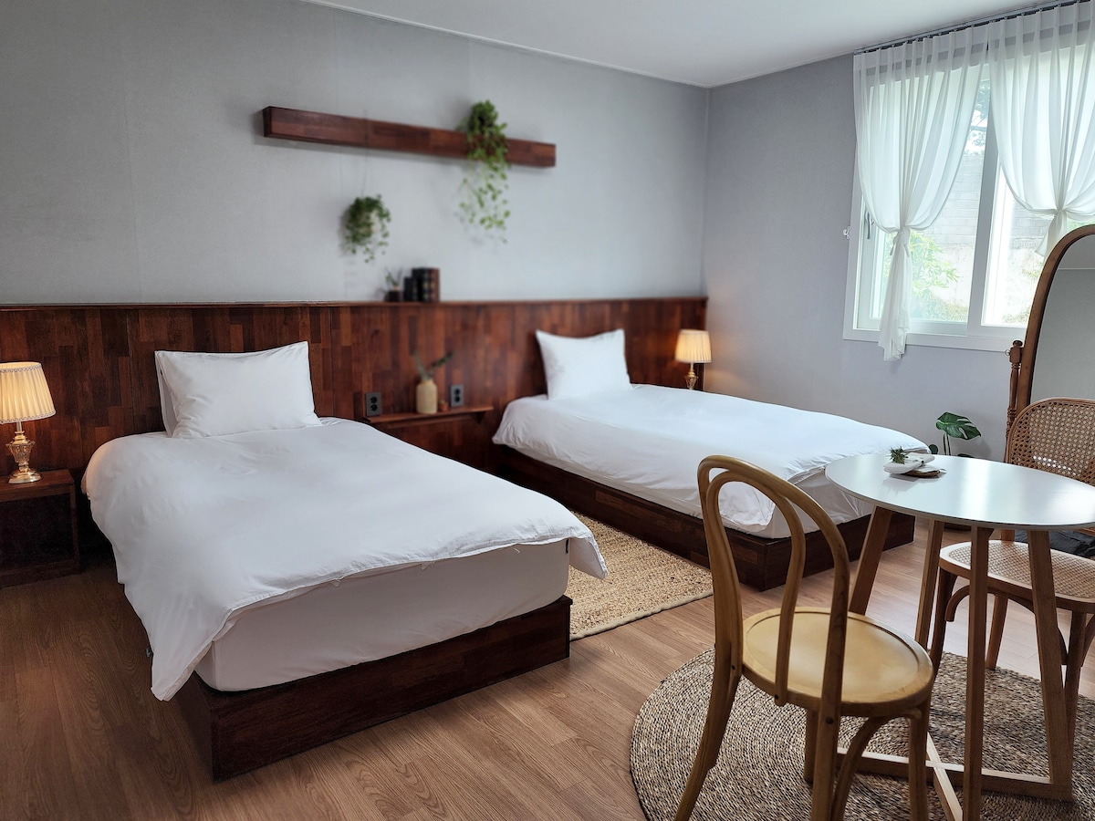 Privát szálláshely Pyoseonban. A ház 23 pyeong, a kert pedig körülbelül 300 pyeong. A szabadtéri melegvizes fürdő minden évszakban elérhető. 12 éves kortól léphetsz be.(Kérjük, vedd fel velünk a kapcsolatot 12 évesnél fiatalabb/legfeljebb 3 személy léphet be) [📌 Alapértelmezés szerint csak 2 fő (queen méretű ágy, paplan) van beállítva. Ha 3 személy vagytok, vagy 2 személy külön alszik, kérjük, lépjetek kapcsolatba velünk a további beállításokért.] 3 ~ 5 perc sétára a Pyoseon strandtól. (Salt Mak Beach 3 perc autóval/szörfözés) Üdvözlő étel biztosítva (csésze tészta) – 1 alkalommal biztosítva (bejelentkezés napján) (A megadott adatok rendszeresen változhatnak.) Nehéz ételt főzni. (Van egy 1 lyukú indukciós tűzhely, de lehet olyan leves, amelynek nincs rámenszaga. Nem főzhetsz erős illatú ételeket, például húst és maeuntangot) Az éttermek és élelmiszerboltok autóval 5 percen belül megközelíthetők. Közeli látnivalók: Pyoseon Beach (5 perc gyalog/1 perc autóval), Seongsan Ilchulbong (20 perc), Jeju Folk Village (3 perc) és Jeju Herb Garden (6 perc). A Taerabioreumba 15 percen belül is eljuthatsz.