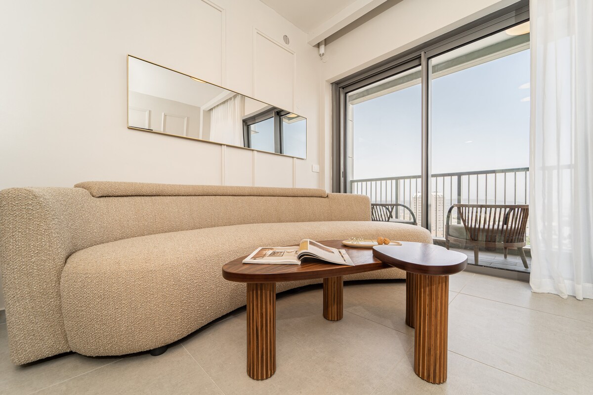 This beautiful 54 m2 apt has an open concept kitchen to the living/dining room one beautiful bedroom, 1 bathroom and a spacious balcony with a stunning view overlooking HAR HABAYIT. The apt is decorated in high-end furniture to meet your all needs... The kitchen is fully equipped with fridge, oven, stove top, dishwasher and Microwave oven. In the living room you can enjoy a comfortable sofa as well as an armchair and a dining room table which can accommodate 5 comfortably.