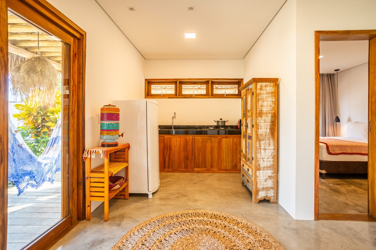Élvezd az egyszerűséget ezen a csendes és jó elhelyezkedésű helyen. Jeri falujának közepén vagyunk, közel a piacokhoz, egy gyógyszertárhoz és 800 méterre a strandtól. Itt minden megvan, hogy otthon érezd magad. A környezetünk egy hálószobából áll, amelyben egy kétszemélyes ágy és egy függőágy található. Légkondicionáló, TV, ventilátor és szekrény a ruháidnak. Konyha: tűzhely, hűtőszekrény és kültéri terület. Konyhai alapkellékek.