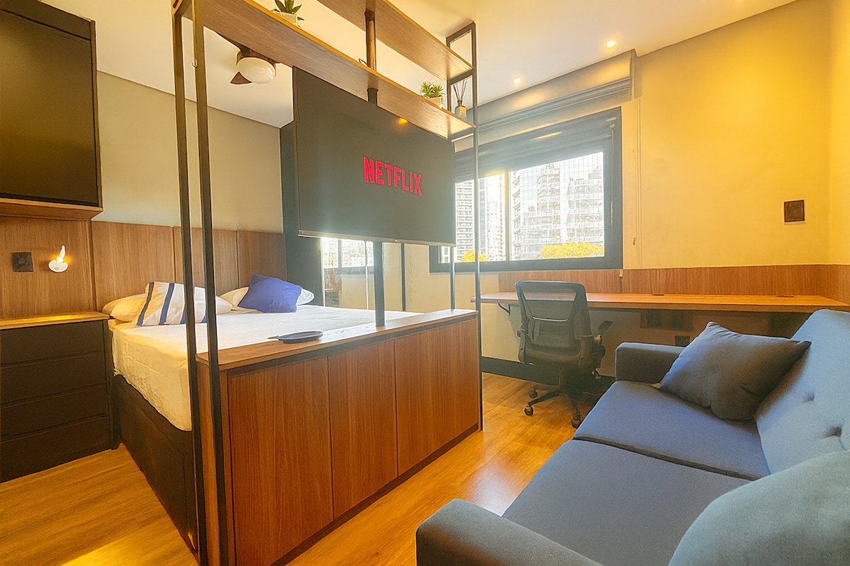 Enjoy the bohemian and artistic Vila Madalena, full of bars, restaurants and cafes. You can get to know the region or even take a tour to city parks with a bike, avaiable free of charge. Will you come to work? Focus on it at the confortable table facing the green balcony with a beautiful view of the tree tops. After all, enjoy the gym, poll, sauna and snooker room for your complete leisure.