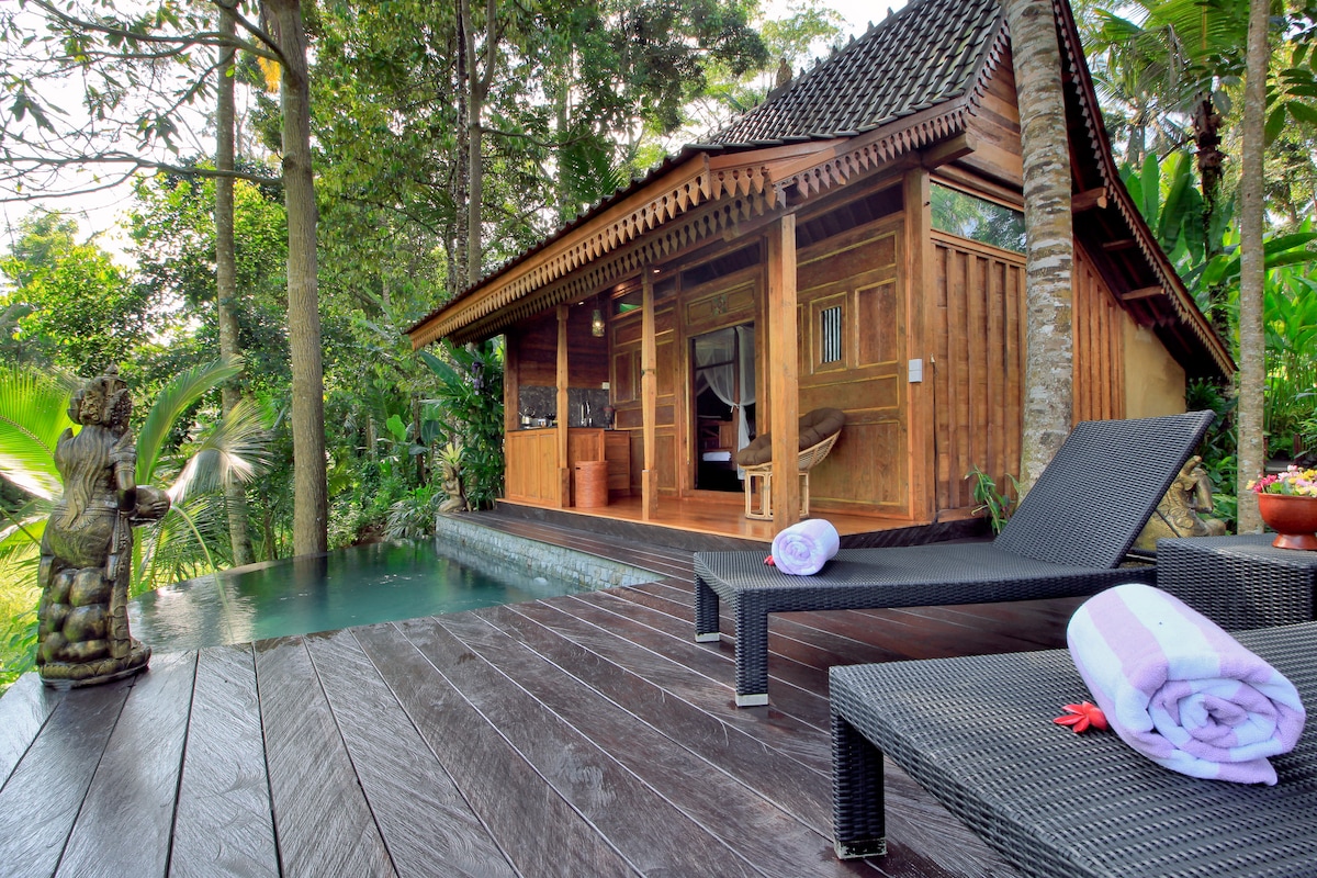 Gyönyörű , békés folyóparti otthon. A házban 2 hálószoba található saját fürdőszobával, a nappaliban pedig több is elfér. Nincs légkondicionáló, de ígérem, hogy nem lesz rá szükséged, valójában elég friss itt. Ideális helyen található a sziget központjának felfedezéséhez. Ha szeretnél megfiatalodni a természetben, ez az egyik legjobb természet, amit Bali kínál. Sétatávolság a vízeséstől, rövid autóút több meleg forráshoz.