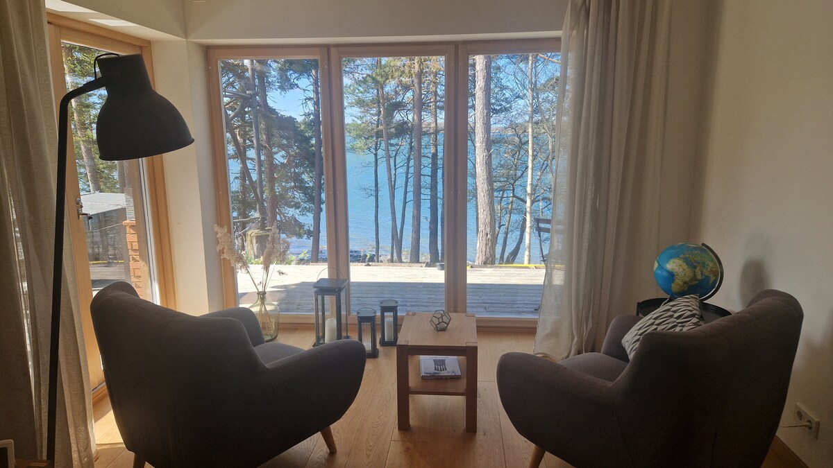 A házikó közvetlenül a tenger mellett található, még mindig csak 6 km-re a városközponttól. A 2. emeleten található a hálószoba, a konyha/nappali és a nagy erkély. Az 1. emeleten van egy fürdőszoba, zuhanyzó és egy kényelmes szauna, ahonnan rendkívüli kilátás nyílik a tengerre. Télen a ház zárva van, amikor nagyon hideg van. Felhívjuk figyelmedet, hogy októbertől márciusig az evezős csónak és a kajakok nem állnak rendelkezésedre.