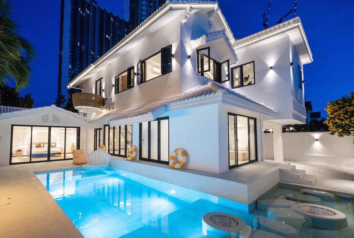 Privát 4 hálószobás, 4 fürdőszobás villa medencével/380 négyzetméter/üdülőhelyi stílusú udvar vízkeringető medencével/strand közelében/kiváló elhelyezkedésű lakóközösség ingyenes parkolás/grillezés