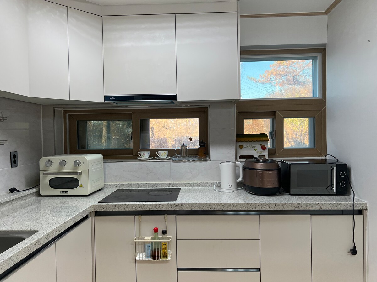 [Camping zone open] Van kempingfelszerelésünk felújítással. Egy kis vidéki ház tele csendes és félreeső vidékkel Ez egy családi ház saját kerttel. Ez egy magánszálláshely, ahol csak egy csapat használhatja a ház összes helyiségét. A kiadó helyet a házigazda kezeli, ezért mindig dolgozunk rajta, hogy tisztán tartsuk. A kertben grillezhetsz, és vannak asztalok és székek is. Legfeljebb 5 személy (3 személy esetén személyenként és éjszakánként 15 000 KRW összegű további díj merül fel.) * A grillező használatakor előre tájékoztass minket. * Környező elhelyezkedés Közel van Chuncheon belvárosához (Myeong-dong alapján), autóval pedig 15 perc alatt elérhető. Az étel a Sinbuk-eup negyedben található, így autóval 5-10 perc alatt kényelmesen megközelítheted a Potato Field Cafe, a Sinbuk and Sambat Cafe Street, a Log Chicken Ribs és a Spring Field Chicken Galbi Streetet. A közeli turisztikai látványosságok közé tartozik a Makguksu Experience Museum, a Legoland, a Soyang Dam, a Cheongpyeongsa, az Obongsan, a Yongwasan, a Gangwon Provincial Garden, az Animation Museum és a World Hot Springs.