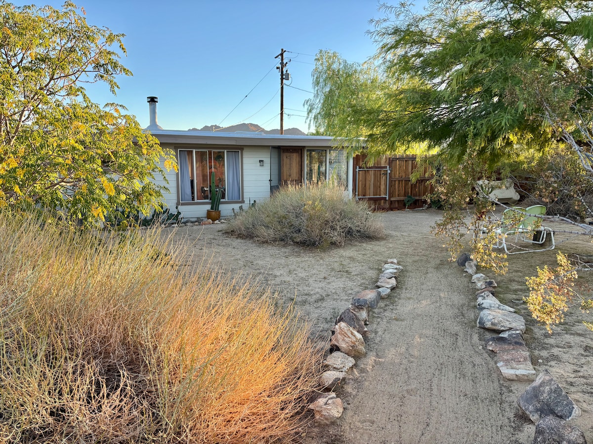 *Csak 20 perc az északi bejárattól a Joshua Tree Nemzeti Parkig! Tökéletes menedék a csillagnézők és álmodozók számára, menekülj a város zajától/kaotikumától. Nem teljesen „hálózatfüggetlen”, de a víkendházunk remek hely a kikapcsolódásra. Ideális romantikus hétvégékhez, vagy azok számára, akik kreatív helyet keresnek. Kicsi, de funkcionális teakonyha, mini hűtőszekrény, légkondicionáló és elektromos fűtés; queen méretű ágy, pótágy egy kanapéágy. Cowboy medence, tűzrakóhely, függőágyak. Csodálatos kilátás a sivatagi napkelte és napnyugta. Gyere el a Joshua Tree-be, és élvezd a víkendház ezen gyöngyszemét