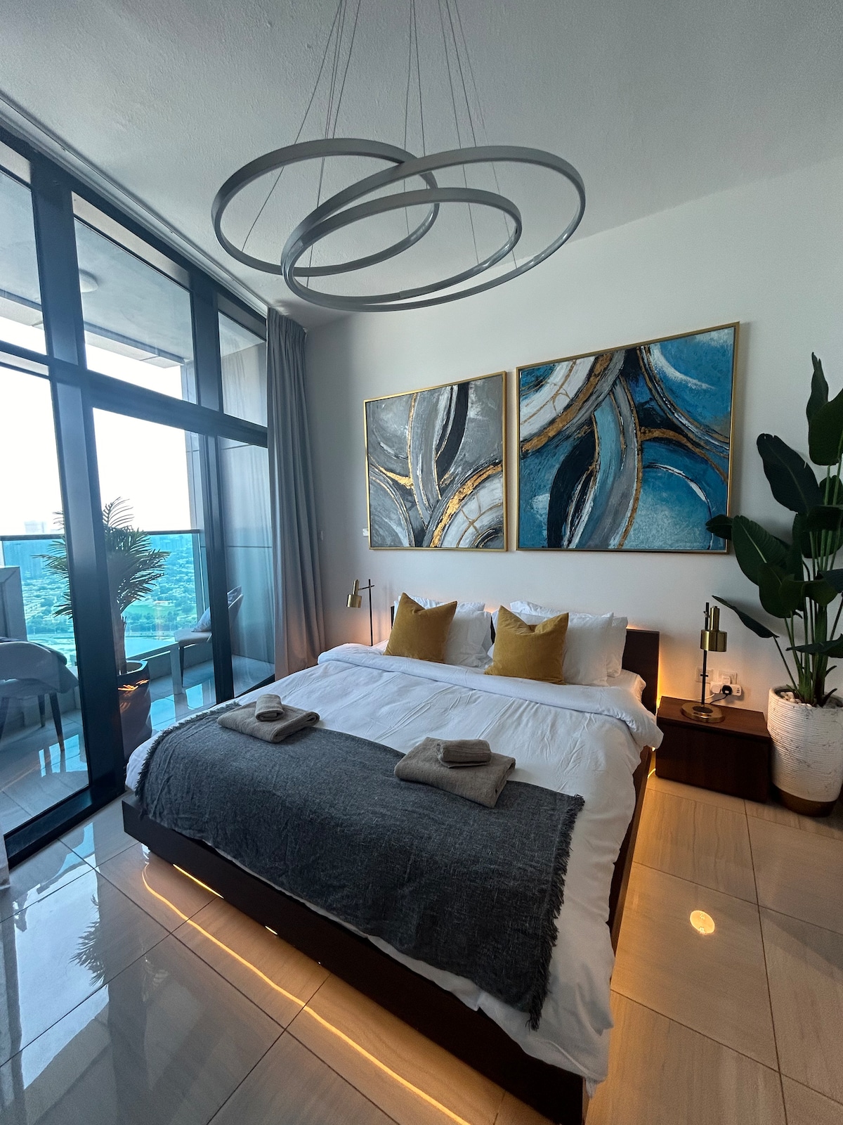 Indulge in luxury at this brand-new, ultra-modern apartment with full lake views and iconic sights of Ain Dubai. Located just 50 meters from the metro, you're only 5 minutes from the Marina and Marina Mall, and a 20-minute walk to the beach. Surrounded by restaurants, supermarkets, and pharmacies—all within a 5-minute walk. Peaceful and stylish, it comfortably hosts 4 guests, offering high-end finishes, private parking, and a truly convenient, upscale stay.