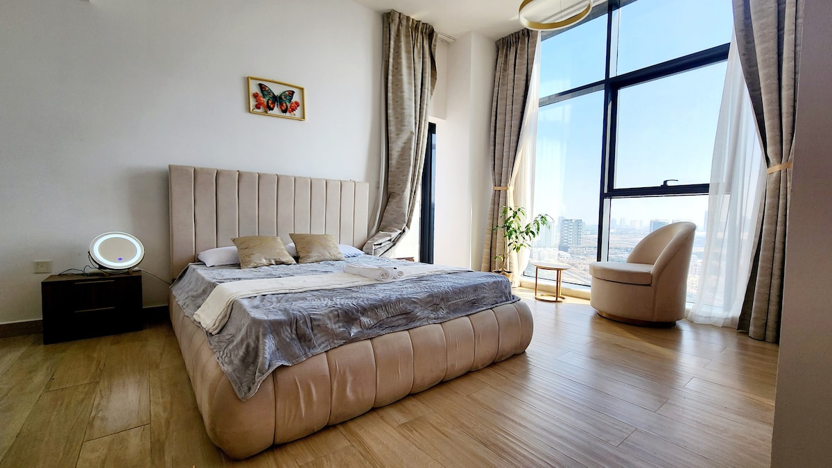 Vadonatúj, 1 hálószobás lakás a legkényelmesebb queen méretű ággyal JVC-ben, erkéllyel és gyönyörű kilátással Dubajra. A lakás teljesen berendezett és jól berendezett, beleértve a tévét, a kényelmes bútorokat, az internet wifit és a légkondicionálást. A modern, teljesen felszerelt konyhában minden megvan, amire szükséged lehet a szálláshelyen. Van egy nagyon kényelmes ágy, ágynemű és törölköző, valamint egy sor fürdőszobai kényelmi szolgáltatás. A szobában felfújható matrac is rendelkezésre áll. A hely