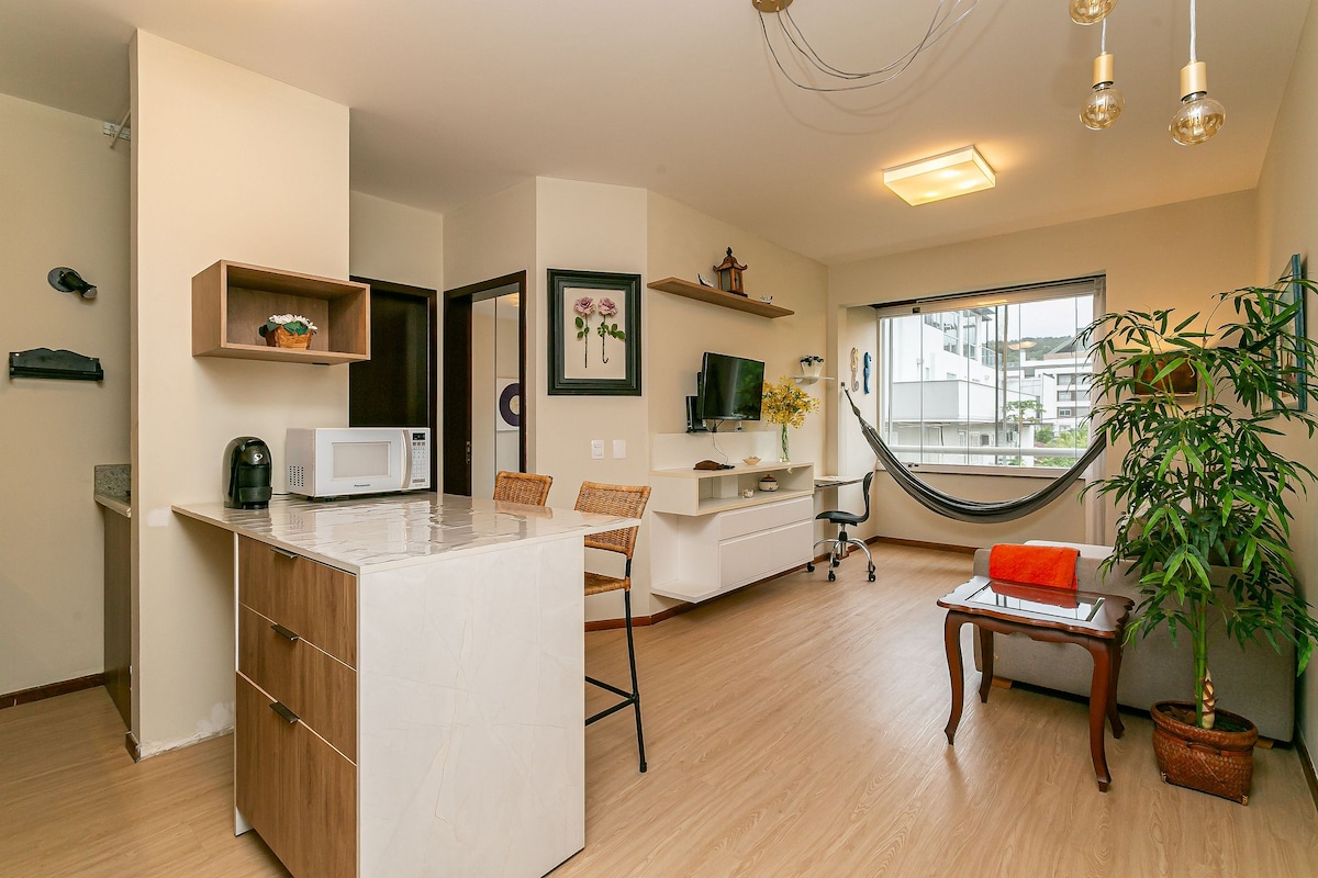 Szállj meg Jurerê (Florianópolis, SC) gyönyörű tengerében egy teljesen modern loftlakásban amerikai konyhával, franciaággyal, Split légkondicionálóval, 40"LED kábellel SmarTV Netflix-szel, minibárral, tűzhellyel, mikrohullámú sütővel, forró fürdővel és nagy erkéllyel, kilátással a tengerre.