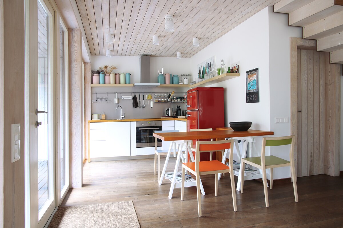 Üdvözlünk a West House-ban, ahol az ünnepek 3 méterrel a föld felett kezdődnek. Ez a kivételes A-frame dizájnház egyedi elrendezésével és az elvárásokon túlmutató otthonérzetével gyönyörködhet. Ragadd meg a fenyőerdő nyugalmát, és tapasztald meg a természet jelenlétét egész évben. A West House mindössze 10 perces sétára található a festői Bernāti strandtól. Tökéletes 5+1 vendég számára. Lazíts, töltődj fel, töltődj fel, és teremts értékes emlékeket ebben a rendkívüli természeti menekülésben.