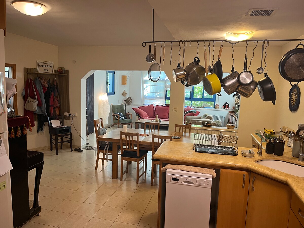 Forget your worries in this spacious and serene space. It is the upper floor of a private house with a private entrance. Very easy access from the street. Plenty of free parking. You will definitely enjoy the balcony off the living room overlooking the Galilee mountains and the northern sea shore. In the living room there is a large, 65”, TV with Netflix, Israeli channels and more. Self check in (at 3:00 pm) and checkout (at 11 am). Please let us know if you will need one or two bedrooms.
