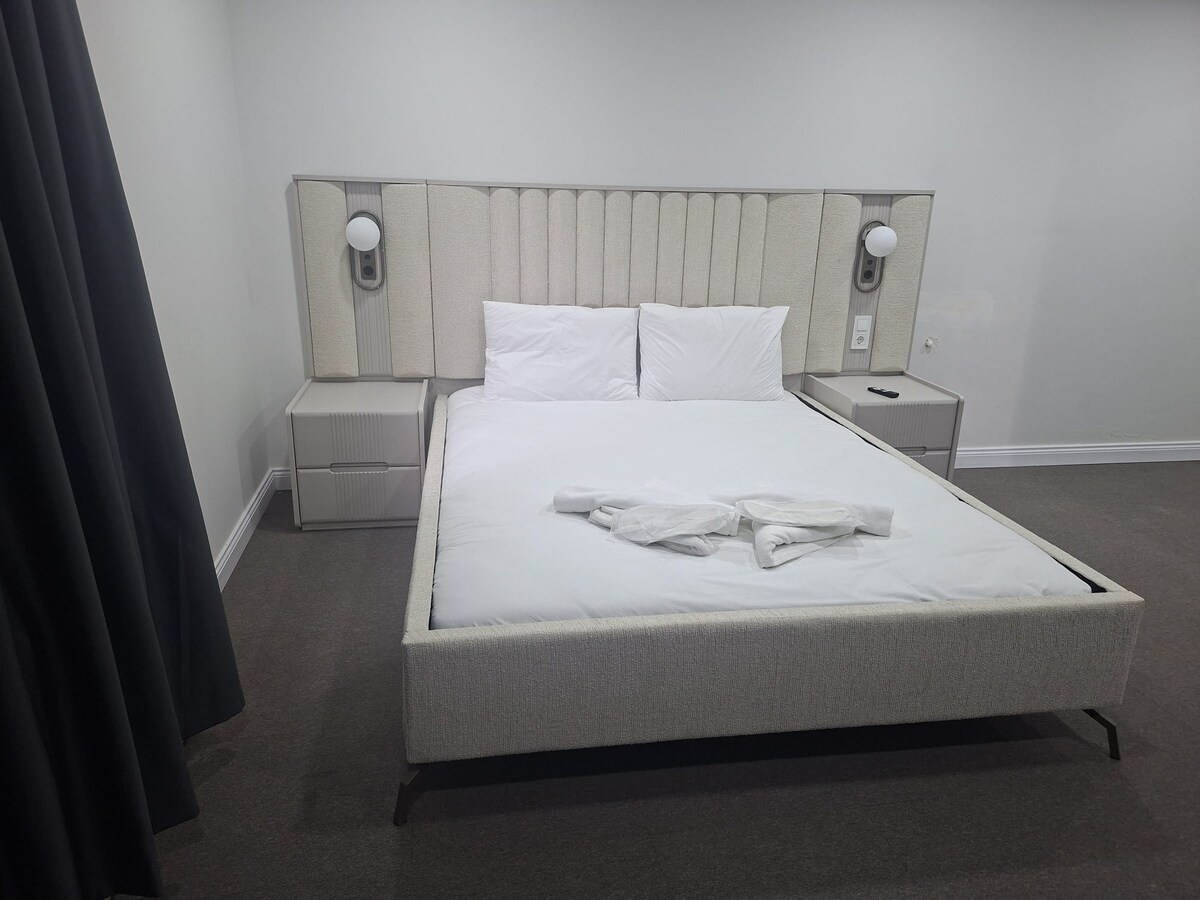 This spacious and airy 1+1 suite comfortably accommodates up to 4 guests, making it ideal for families, couples, or travelers seeking extra space. Located in a brand-new building, the suite offers a modern, stylish, and comfortable living area. The room is suitable for kitchen use, and kitchenware is provided upon request at check-in. Perfect for guests and travelers looking for a comfortable, spacious, and well-designed stay in a new building.