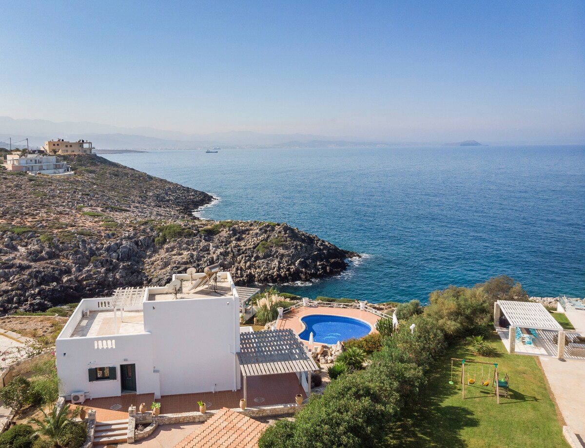 Ez egy tágas, 200 m2-es, új építésű villa gyönyörű kilátással a tengerre a három hálószobából. A helyszín mindössze 6 perc sétára található az Agios Onoufrios strandtól, 15 perc autóútra a Chania repülőtértől, 20 percre a városközponttól és az óvárostól. A 7-20 perces vezetési távolságon 6 további homokos strand található. A következő faluban 3 perc autóval szupermarketek pékségek és éttermek találhatók. Az éttermek némelyike felár nélkül is szállíthat ételt a villába.