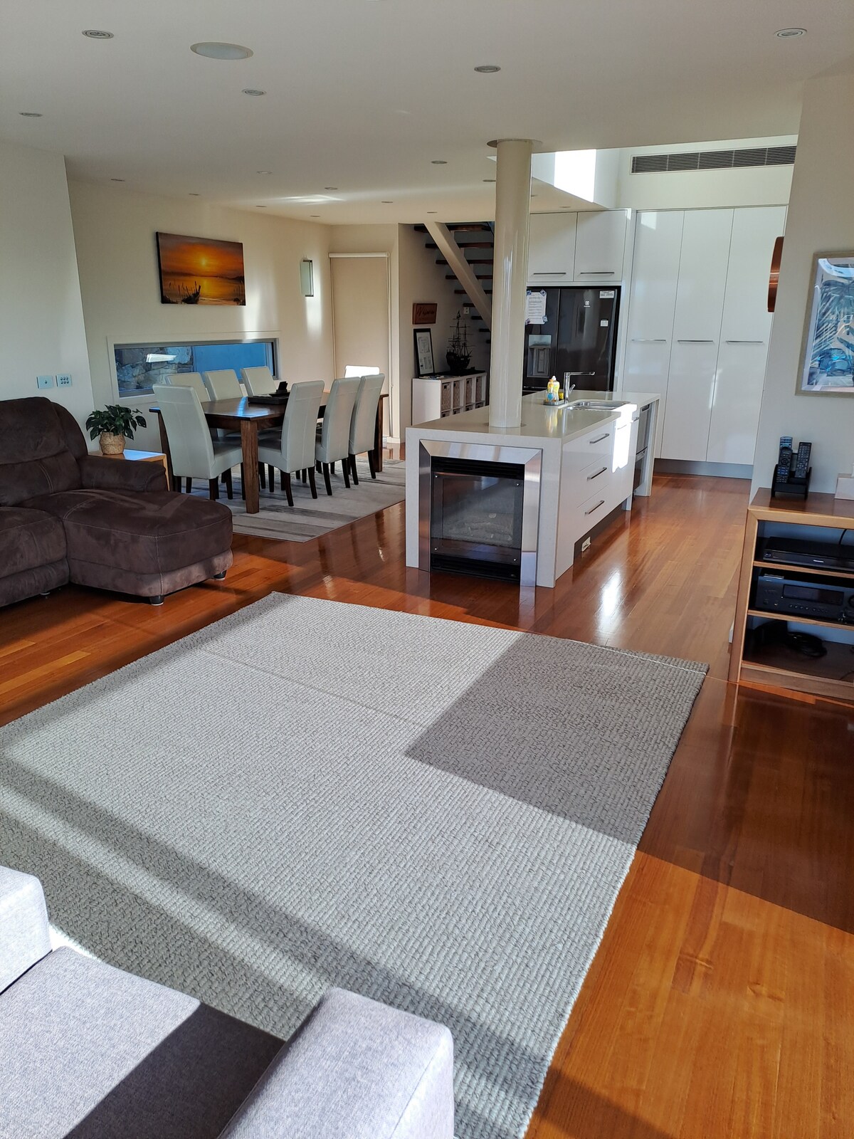 Take it easy at this unique and tranquil getaway. The three bedroom apartment is on the top floor of a two level property. It has street-level access requiring no stairs. From the moment the birds wake you, through to the gorgeous sunsets you will be mesmerised by the view of Lake King. Metung offers a variety of activities such as boating, fishing, sailing, walking and cycling. The State Forests and beaches are a short drive away. Metung village is a 1.5km walk or drive away.