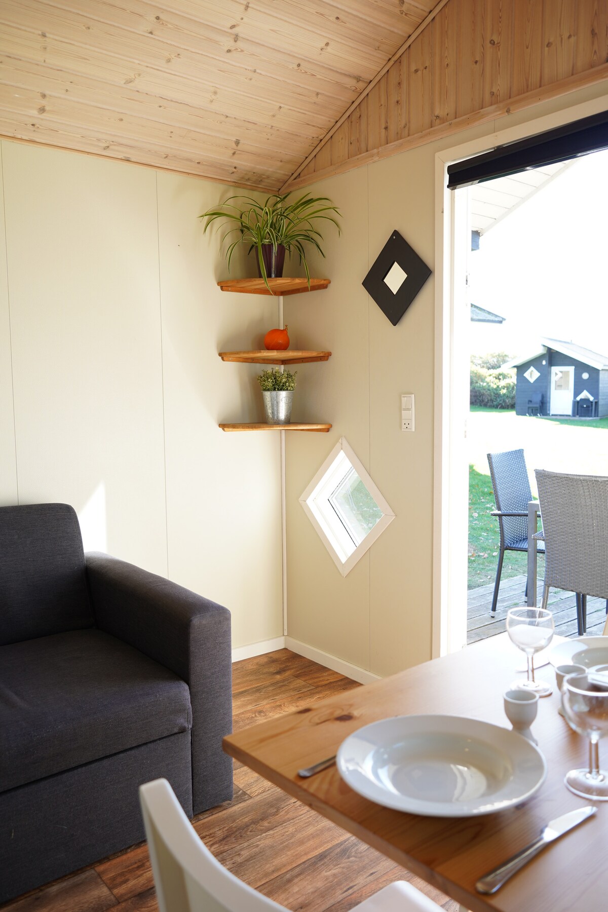 Élvezd az egyszerű és hangulatos kempingezést 17 m²-es kempingházainkban, amelyekben akár 4 fő is elfér. A házikóban van egy hálószoba franciaággyal, egy kétszemélyes kanapéágy a nappaliban, egy kis konyharész edényekkel és étkezőrésszel, valamint egy saját terasz asztallal és székekkel. Tökéletes azoknak, akik igazi kempinghangulatot szeretnének tetővel a fejük felett – közel a strandhoz, a medencéhez, a játszótérhez és a Vesterlyng Camping minden létesítményéhez.