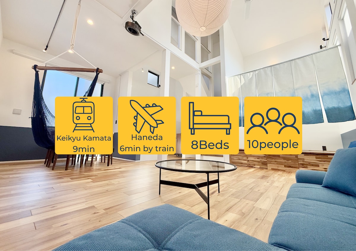 Újonnan berendezett ház, nagyon otthonos és kényelmes. 3 nagy hálószoba áll rendelkezésre, legfeljebb 8 személy számára. A ház jogi tulajdonban van, és a japán kormány által kiállított működési engedéllyel rendelkezik. Megszállhatsz a házban anélkül, hogy aggódnod kellene a japán jogszabályok megsértése miatt. A hanedai repülőtérről is nagyon kényelmes a közlekedés, mivel gyalog 5 percre van a Keikyu Kamata állomástól. 【Méret】 72 négyzetméter + nagy loftlakás + tetőtéri erkély
