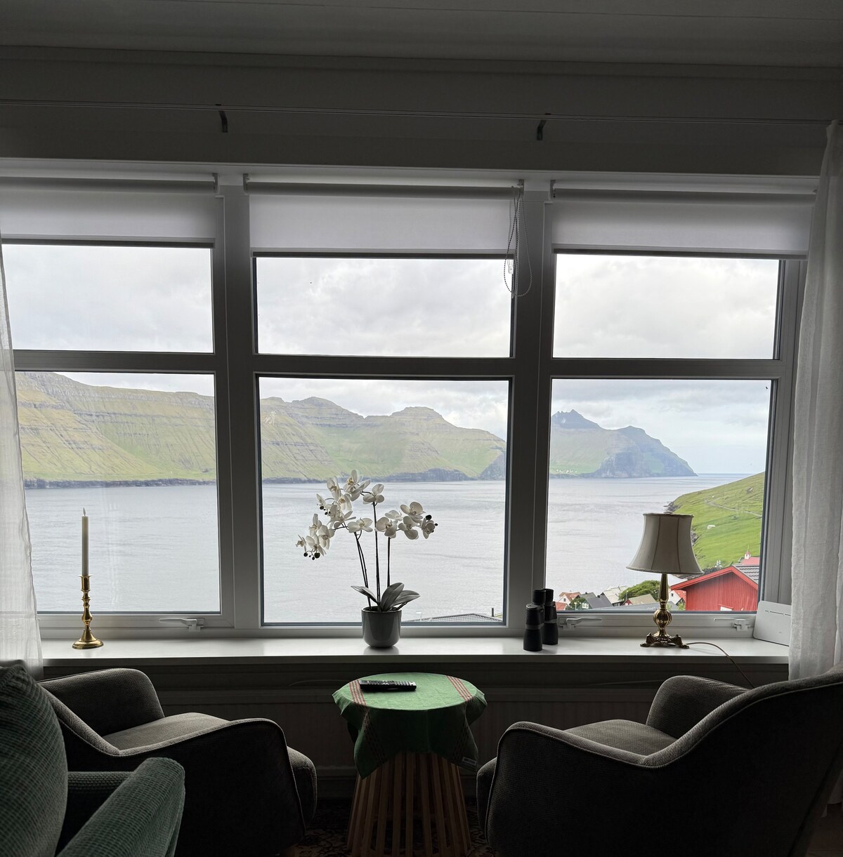 Large, peaceful apartment in the middle of the Faroe Islands. Geographically central. The longest distance by car is approximately 1 hour's drive. 6 of the islands are connected by tunnels and bridges. It is about 15 min to Tórshavn through the new underwater tunnel. Quiet village by the sea. Nice view from the livingroom. You will love my home because of the peace, the view and the surroundings.
