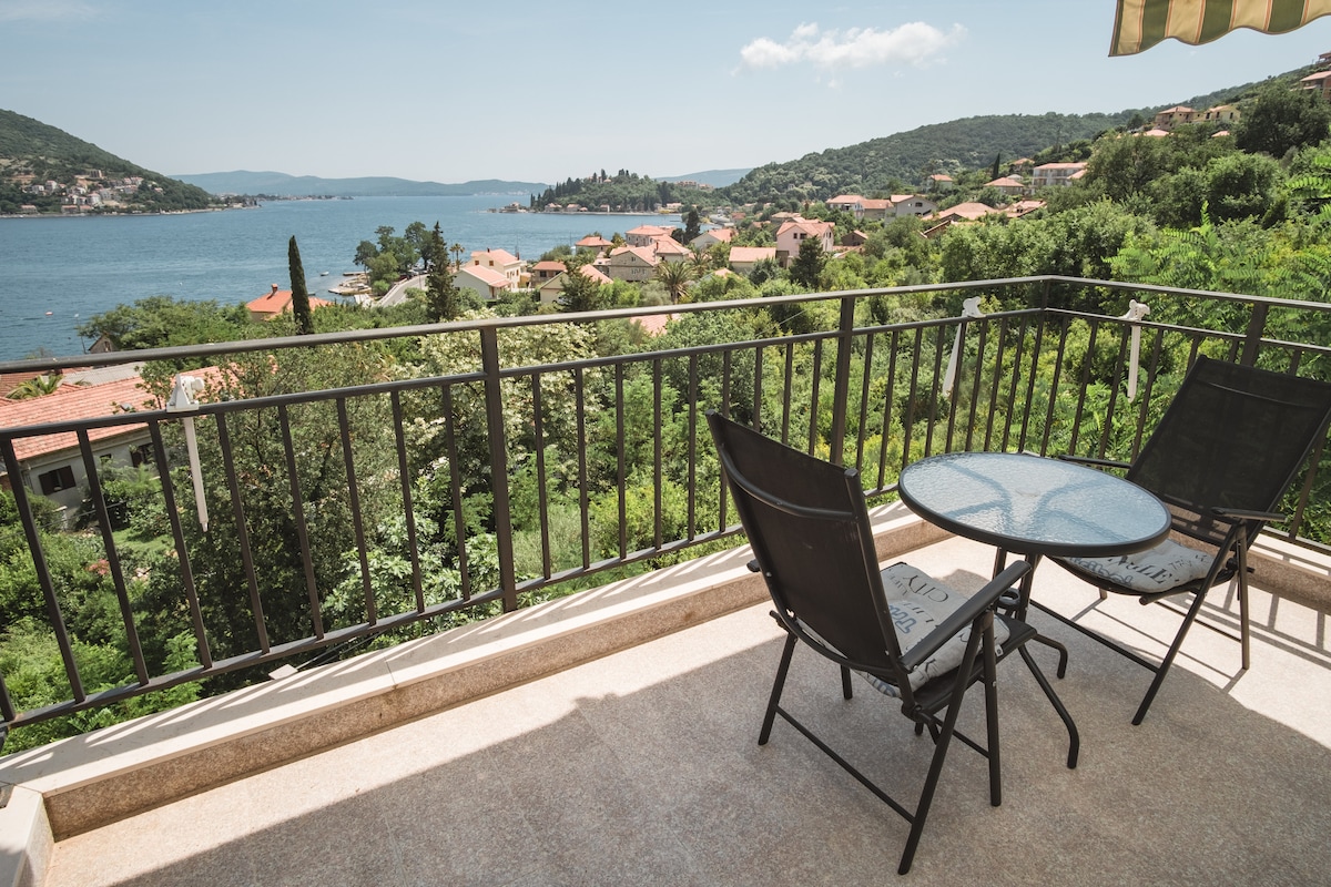 A stúdió/lakás a ház első emeletén található, saját konyhával, fürdőszobával és saját erkéllyel. Az erkélyről gyönyörű kilátás nyílik a Boka-öbölre és a Verige-szorosra. A vendégek a ház előtti teraszokat is használhatják, amelyek három szinten helyezkednek el. Ezek a teraszok étkezőasztalokat és dohányzóasztalokat, valamint szabadtéri zuhanyzót kínálnak – tökéletes a pihenéshez és a friss tengeri levegő élvezetéhez.