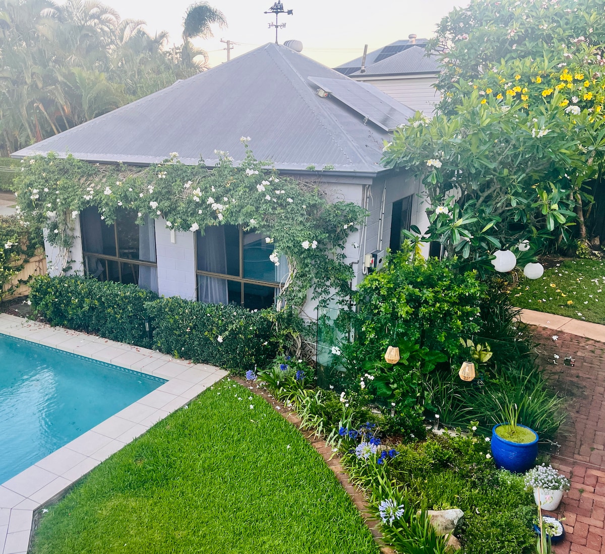 BIG BEAUTIFUL FOR FAMILIES. MANAGED PERSONALLY. VERY WELL EQUIPPED, CLEAN heritage home. FULLY air-conditioned, TWO Bathrooms. COVERED PARKING, BIG COVERED deck overlooking PRIVATE TROPICAL GARDEN, gourmet kitchen, BIG TV Disney/Netflix, 4 spacious Bedrooms (QB, DB, 2 SGL). Walk to Southbank Beach, visit iconic Brisbane attractions. Stay in clean space, near CBD, Southbank, beach, restaurants, IMAX, museums/galleries, theatres, stadiums, hospitals, universities, markets, mall, nightclubs.