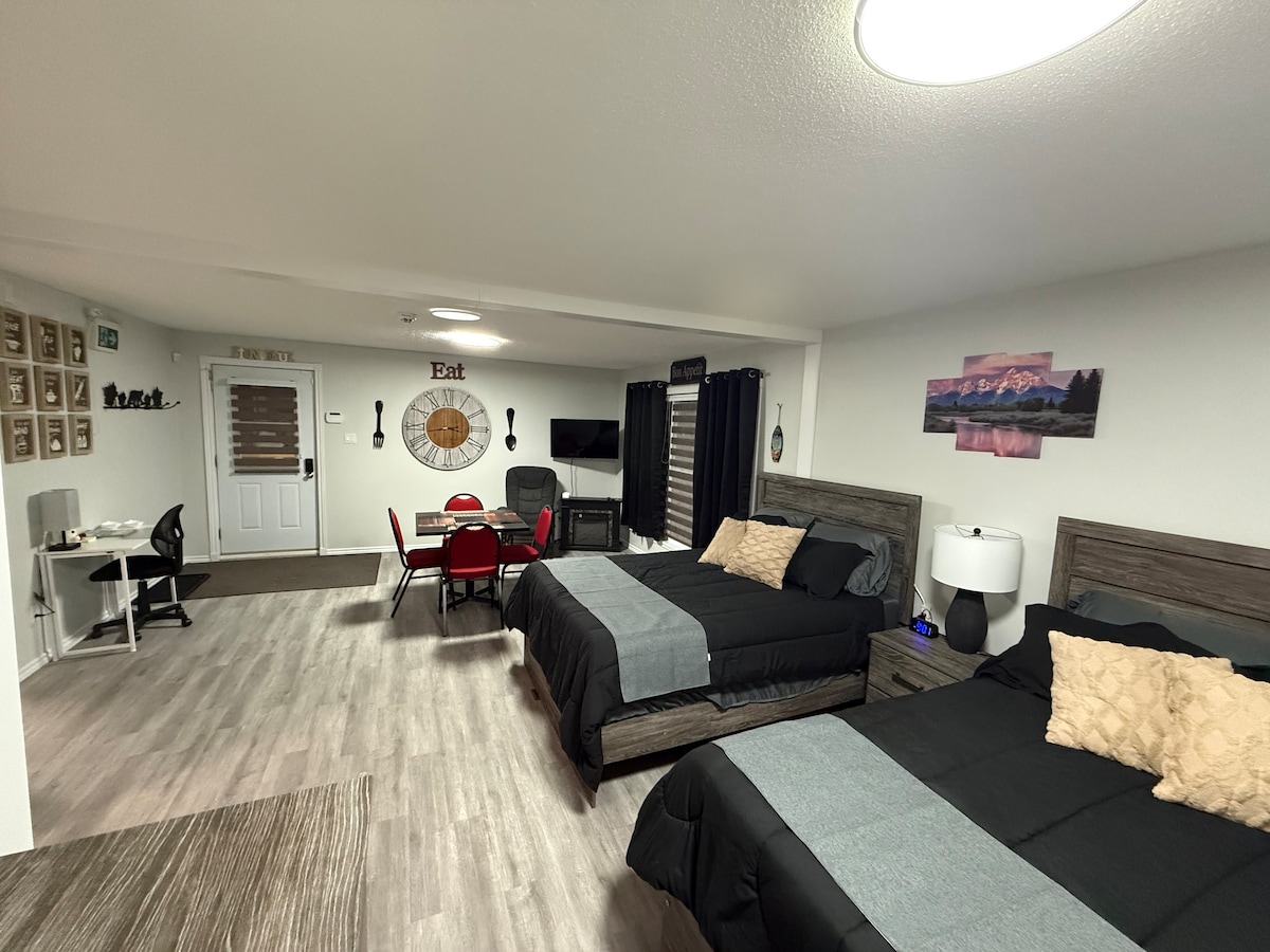 Tiszta, gyönyörű és tágas, 1 hálószobás lakosztály. Újonnan felújított egység, kényelmesen elfér 2 fő a rövid vagy hosszú távú foglalásokhoz: privát hátsó bejárat, 2 parkolóhely és/vagy elegendő hely teherautók és pótkocsik számára, ha szükséges. Ez egy tiszta, félig finom, szintszintes lakás világos és nyitott koncepciójú nappalival, teljesen felszerelt konyhával, utazási méretű piperecikkekkel az induláshoz, különféle törölközőkkel és egy king-size ággyal a jó éjszakai alváshoz. Háziállatot nem lehet hozni. tilos A dohányzás. Több egység otthona, így nagyobb csoportok is elszállásolhatók